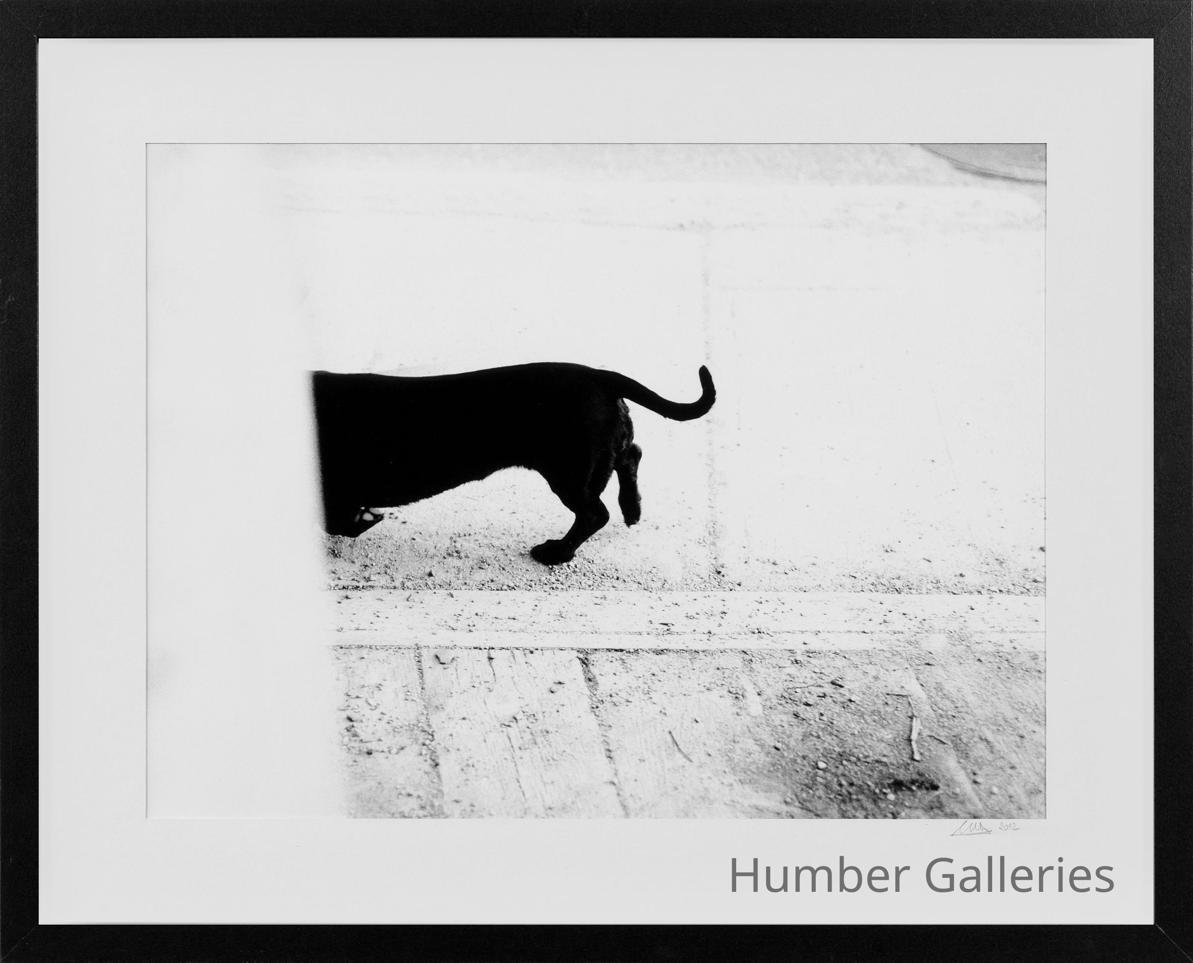 This monochrome photographic print depicts the back and hind legs of a dachshund, walking on a paved walkway. The head and front paws of the dog are mostly obscured, making the identity of the animal depicted not immediately obvious.Collection
