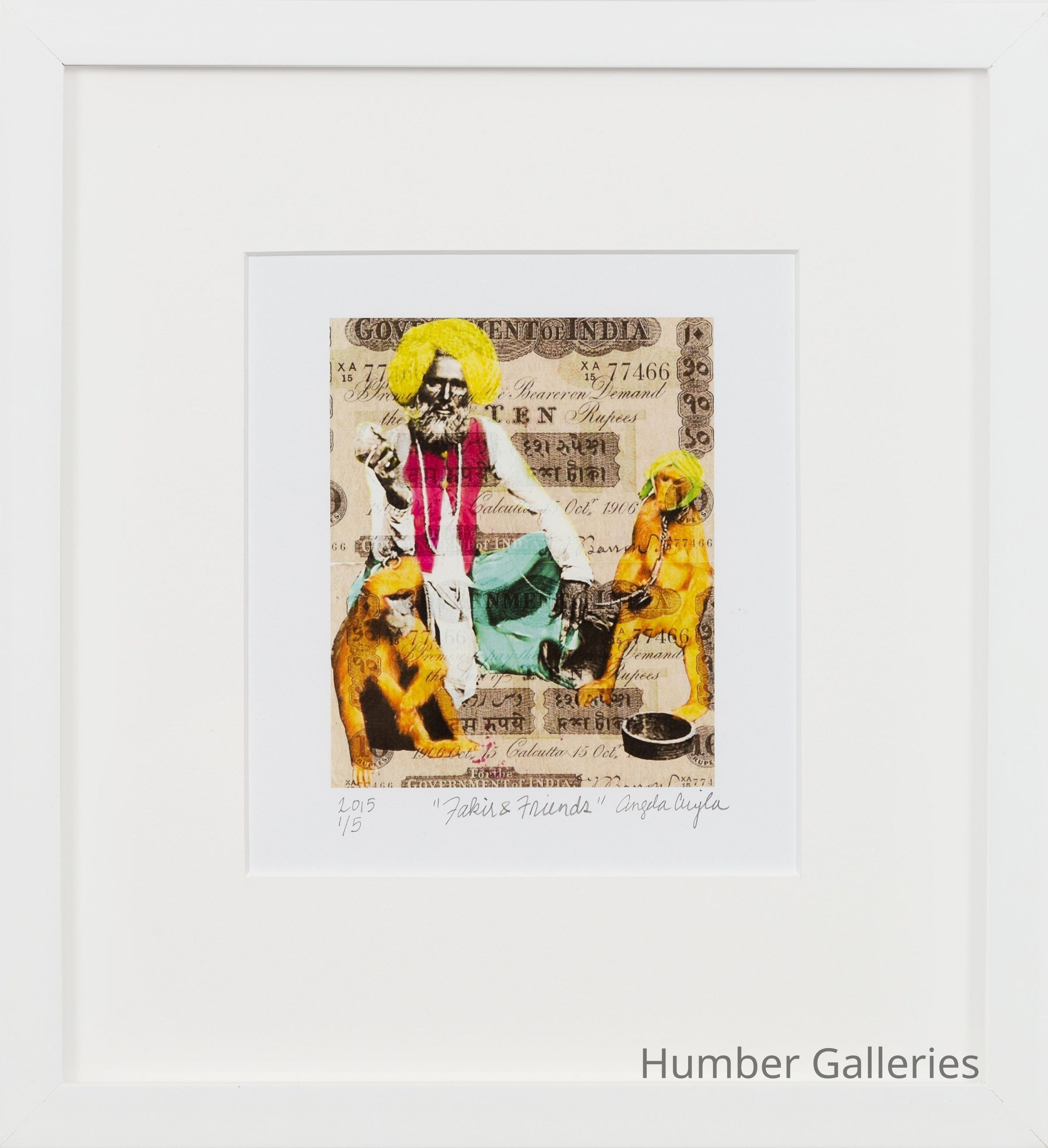 Aujla’s Fakir and Friends uses an archival image by Frank Carpenter entitled Fakir and Monkeys, part of the collection of the US Library of Congress. Aujla reimagines Carpenter's Orientalist image by layering highly saturated colours to contemporize the image, and to bring contrast between the brightly coloured foreground subjects and the antiqued Indian banknotes in the background. In Arabic, the word fakir is loosely translated into “poor man”, as they were ascetics who renounced all worldly possessions. Popular characterizations of fakirs have strayed from the original definition, and they became thought of as beggars or swindlers. These street performers were popular subjects for the Western orientalist lens fascinated with “The Far East”.Collection