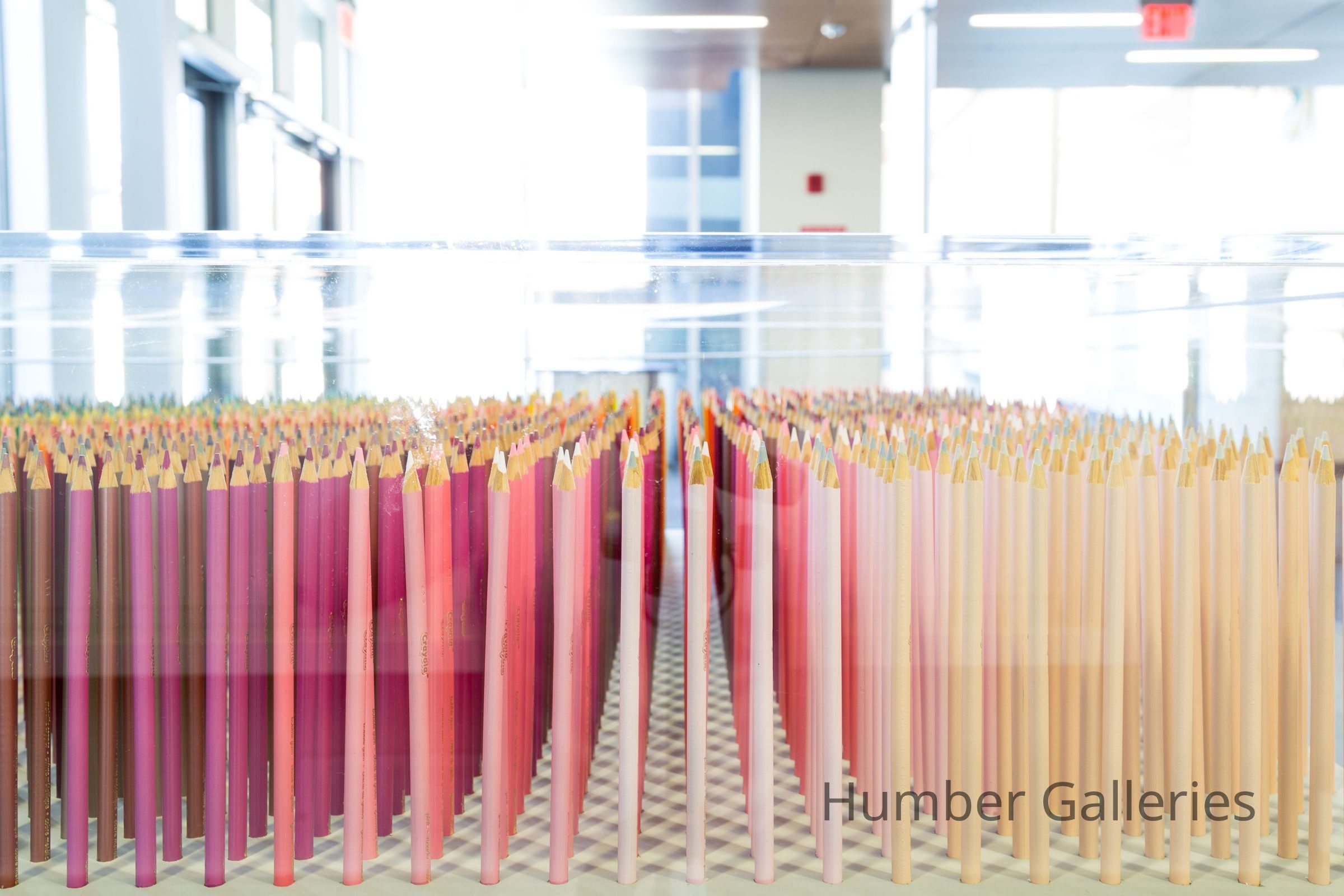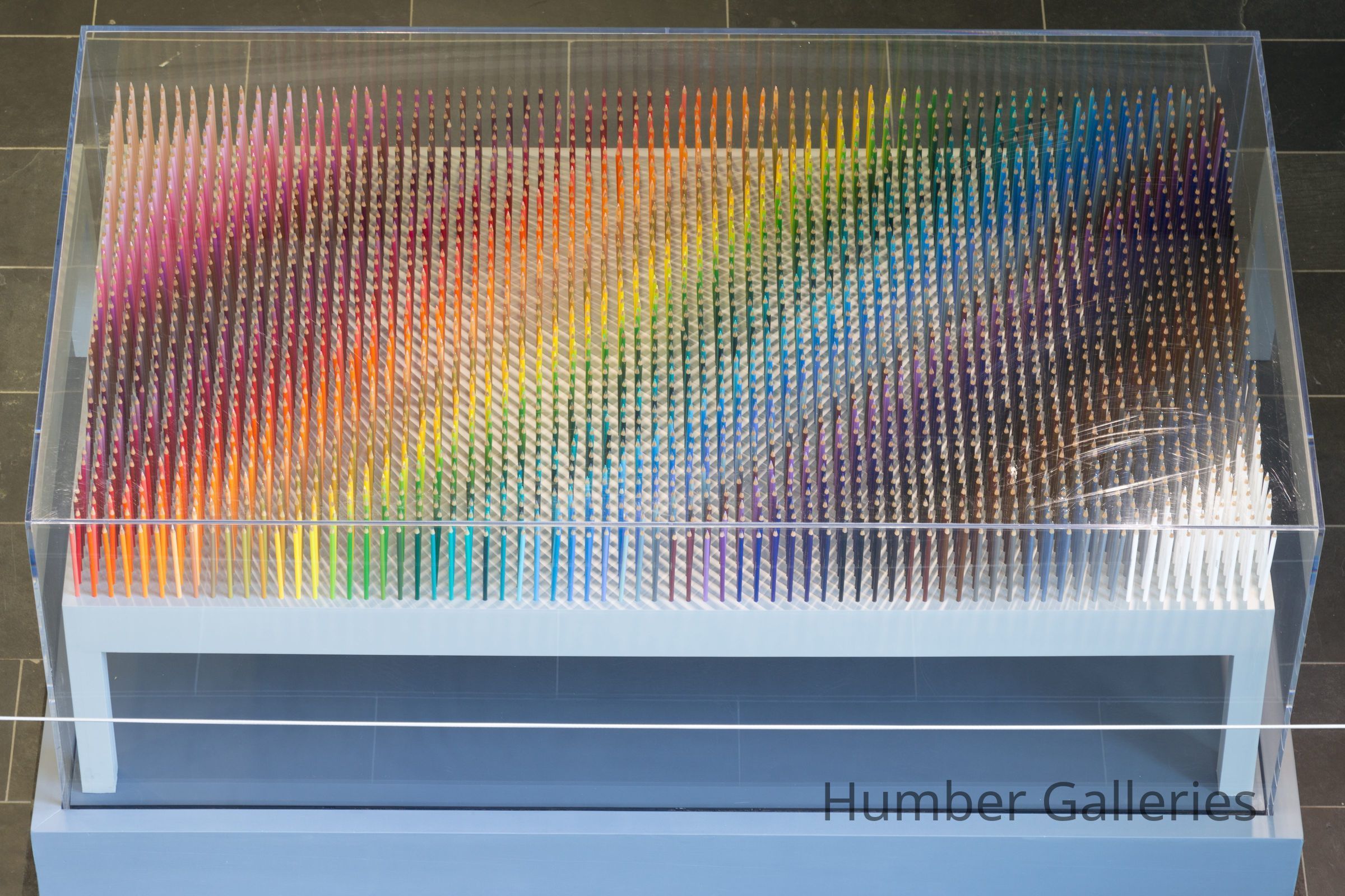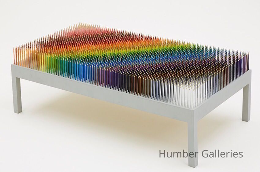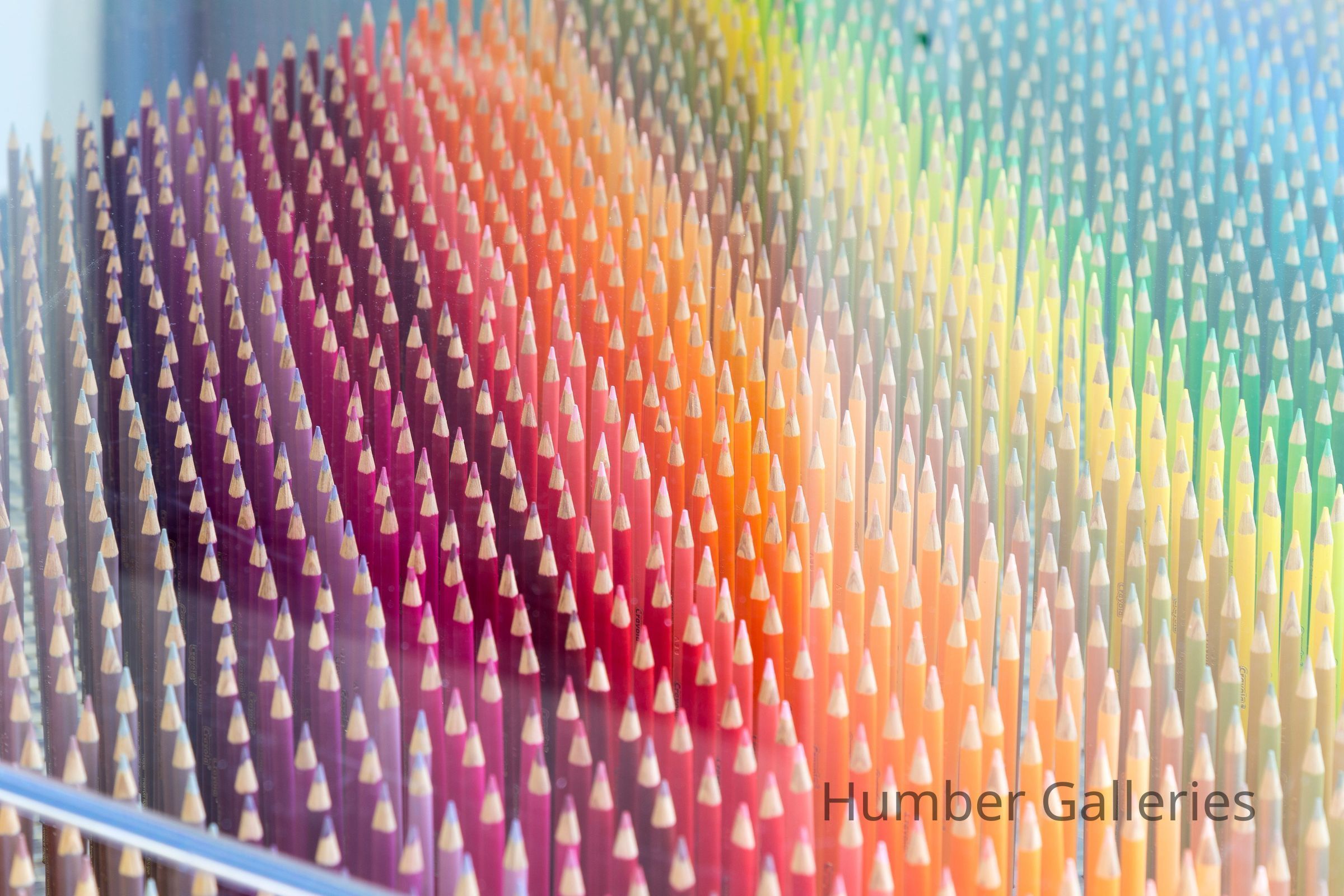 "What makes an object art? This piece, created by Vancouver-based artist Ben Skinner, invites viewers to consider this question. Comprised of 2,698 pencils in 58 unique shades arranged in a diagonal spectrum atop a low table, The Colour Field appropriates the instruments of art, incorporating the pencils used to make art into an art object themselves. The strategy to reposition everyday objects is a foundational tenet of modern art history and traces its roots to artist Marcel Duchamp and his iconic ""readymades"". Skinner continues to move this conversation forward with works like The Colour Field.