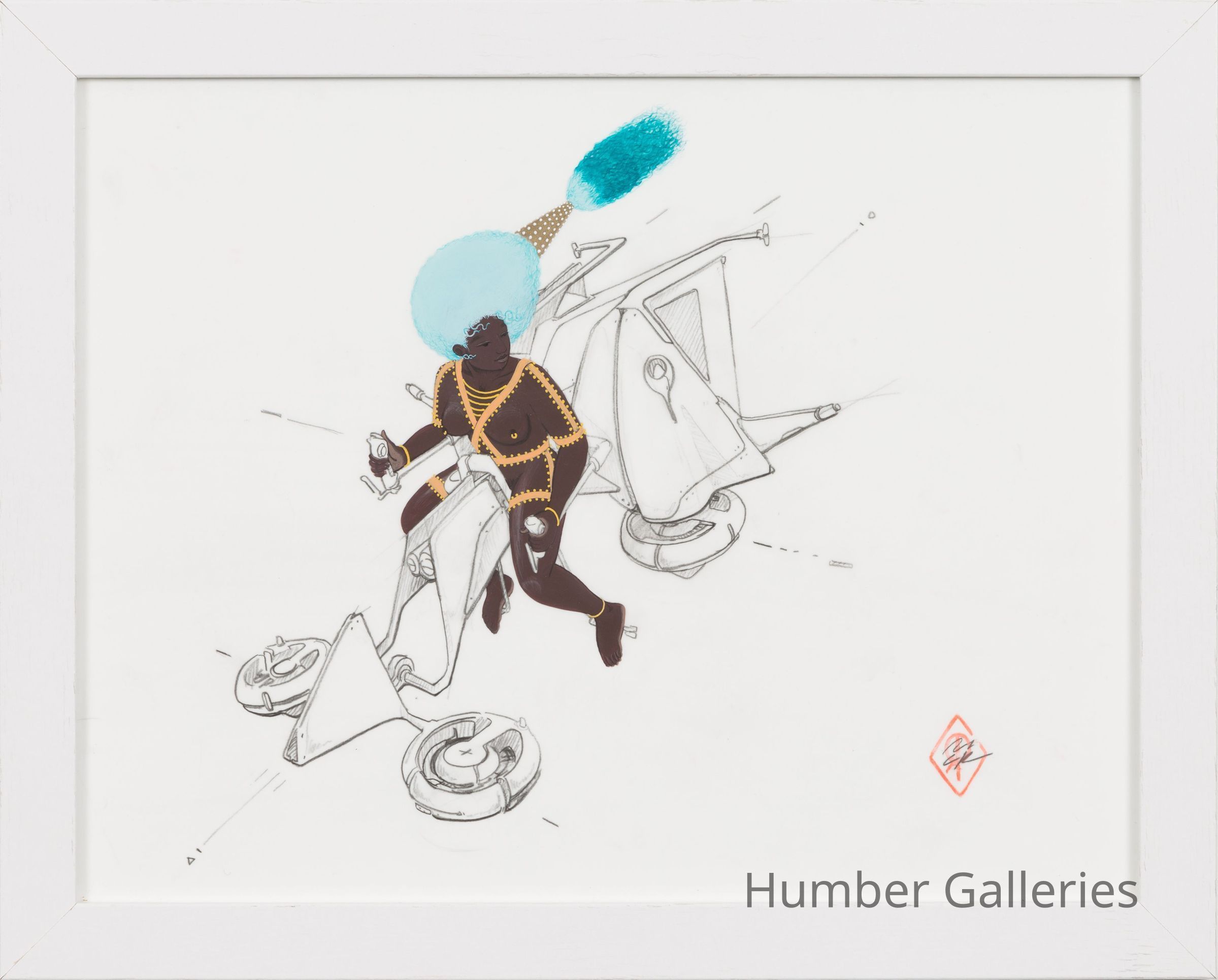 This work, part of a series with HUM-2016-00008, takes inspiration from sci-fi and the Afrofuturism art & cultural movement, depicting women of colour in roles that defy stereotypes by reclaiming elements of science fiction and popular entertainment. This image depicts a dark-skinned woman with pale blue hair, riding a futuristic motorcycle - the woman is rendered in full colour, whereas the motorcycle and elements of the background are left in sketch form, placing her as the undisputed focus of the composition.Artwork Details