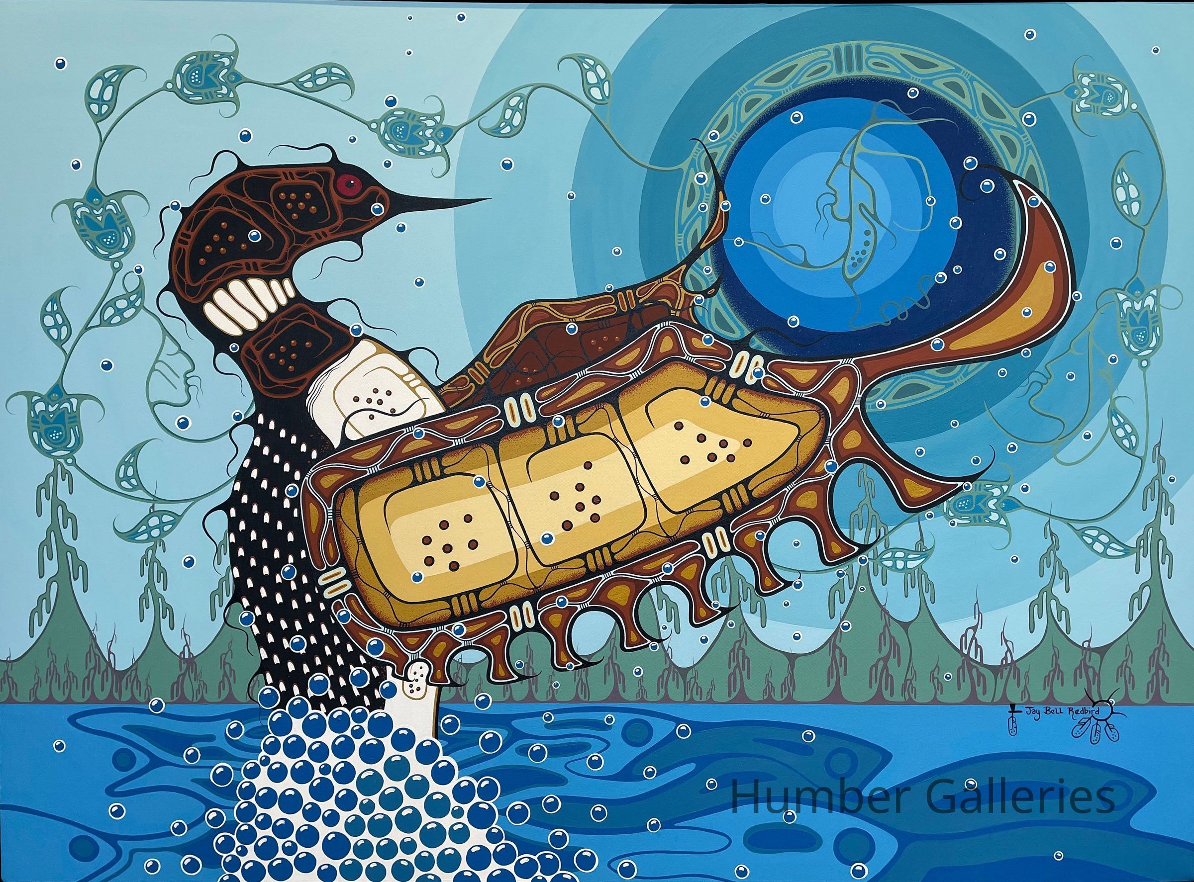 The Loom means loyalty and the flowers are the seven grandfather teachers (Love, Respect, Honesty, Truth, Wisdom, Humility, and Bravery), and the Big Bubble is the Water which is a woman. The Women are Water Carriers, which is connected to the Mother Earth for which you are loyal too. The Bubbles are good memories, the Trees are strength, the Fish are Visionaries, which will teach you about loving Mother Earth. My lines are meant to follow the good life and not to judge other cultures. The 12 Feathers represent each month.