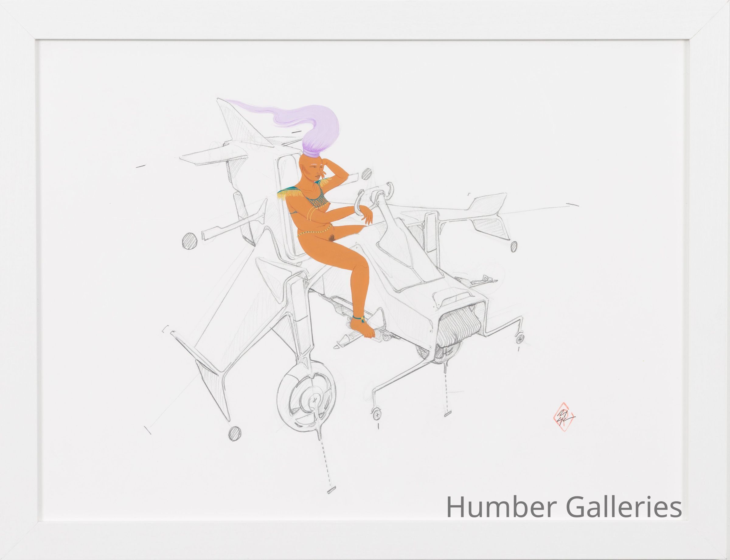 This work, part of a series with HUM-2016-00007, takes inspiration from sci-fi and the Afrofuturism art & cultural movement, depicting women of colour in roles that defy stereotypes by reclaiming elements of science fiction and popular entertainment. This image depicts a brown-skinned woman with lavender hair, seated in a futuristic vehicle - she is rendered in full colour, whereas the vehicle and elements of the background are left in sketch form, placing her as the undisputed focus of the composition.Artwork Details