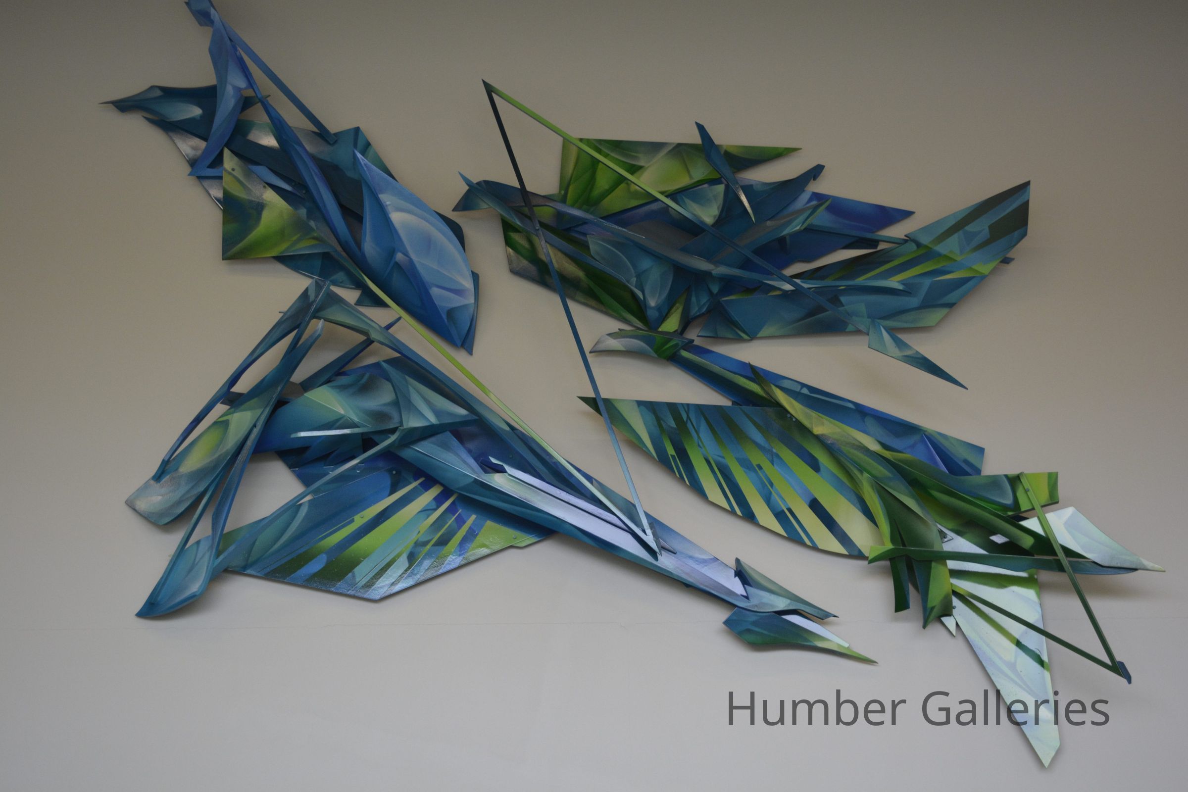 S is a commissioned piece for Humber College, created from spray paint, metal, and hardboard in the form of a stylized “S”, part of the artist’s name. Kwest’s graffiti tag is done in a complex style of interwoven letters known as Wildstyle, an intricate form of graffiti characterized by extremely complicated overlapping letters and shapes. Kwest’s sculptural work pushes the boundaries of his art into three-dimensional work, turning the illusion of volume into a complex decorative art piece.Artwork Details