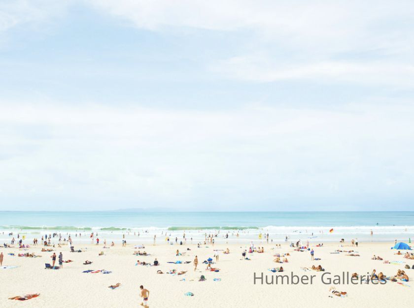 "Under the Sun (NB2) features an immersive blue sky that dominates most of the image, as well as an ocean and a beach crowded with people. In this work, West has brought a feeling of calm and relaxation to a visually chaotic and crowded scene. West uses authoritative horizontal lines to make three divisions; the lines divide the sky, the ocean and the beach. West also uses space in between sections of people to help the viewer digest the photograph and create a sense of openness..