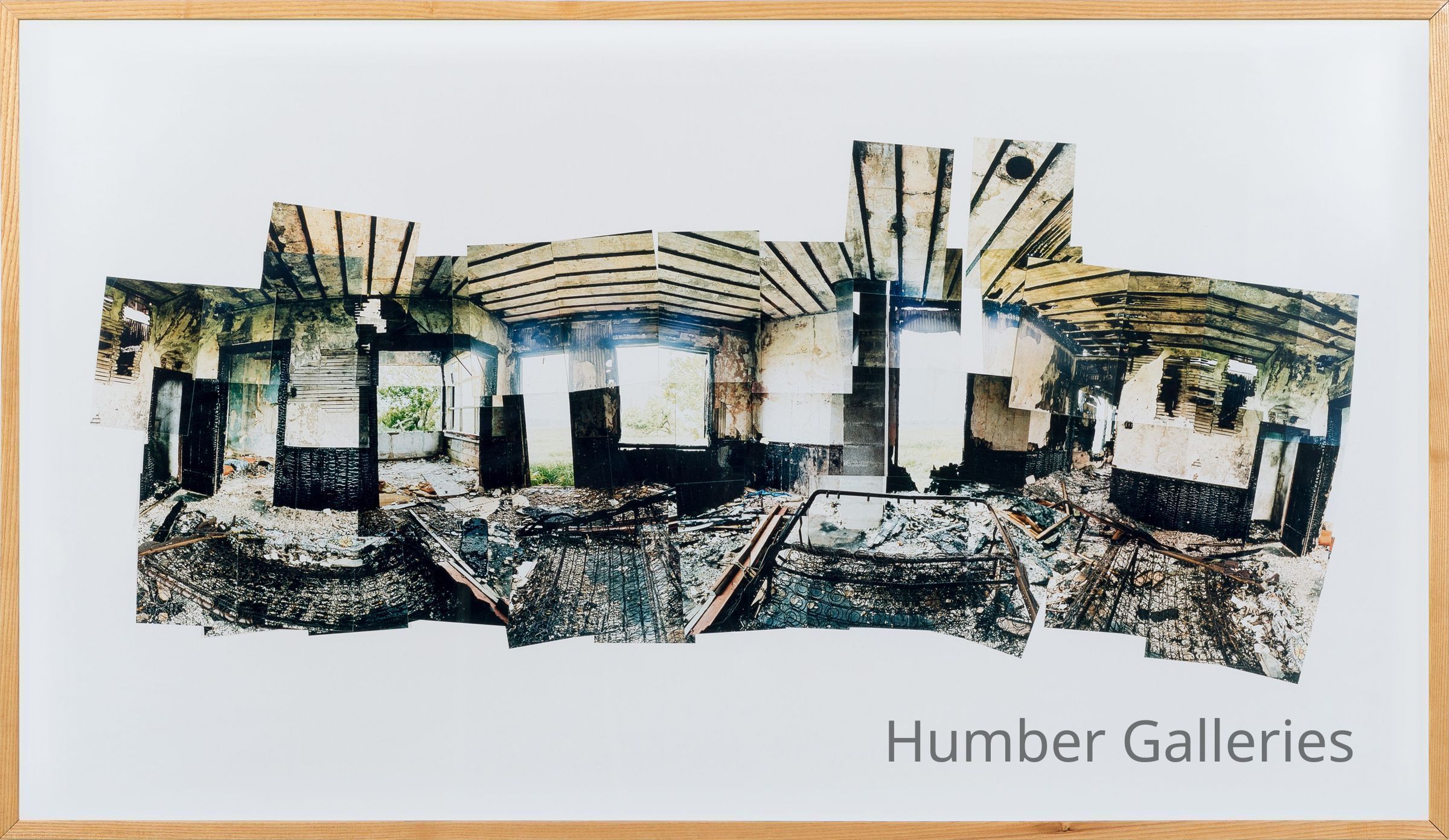 "Similar to the artist's other work Snow Room, the abandoned building depicted in this piece is a burned-out room, the images of which have been cut into rectangular pieces and reassembled to create a disjointed effect that reflects the destruction of the subject matter. The photomontage technique used in this work is called panography or “joiners”, an artistic technique popularized by English artist David Hockney.
