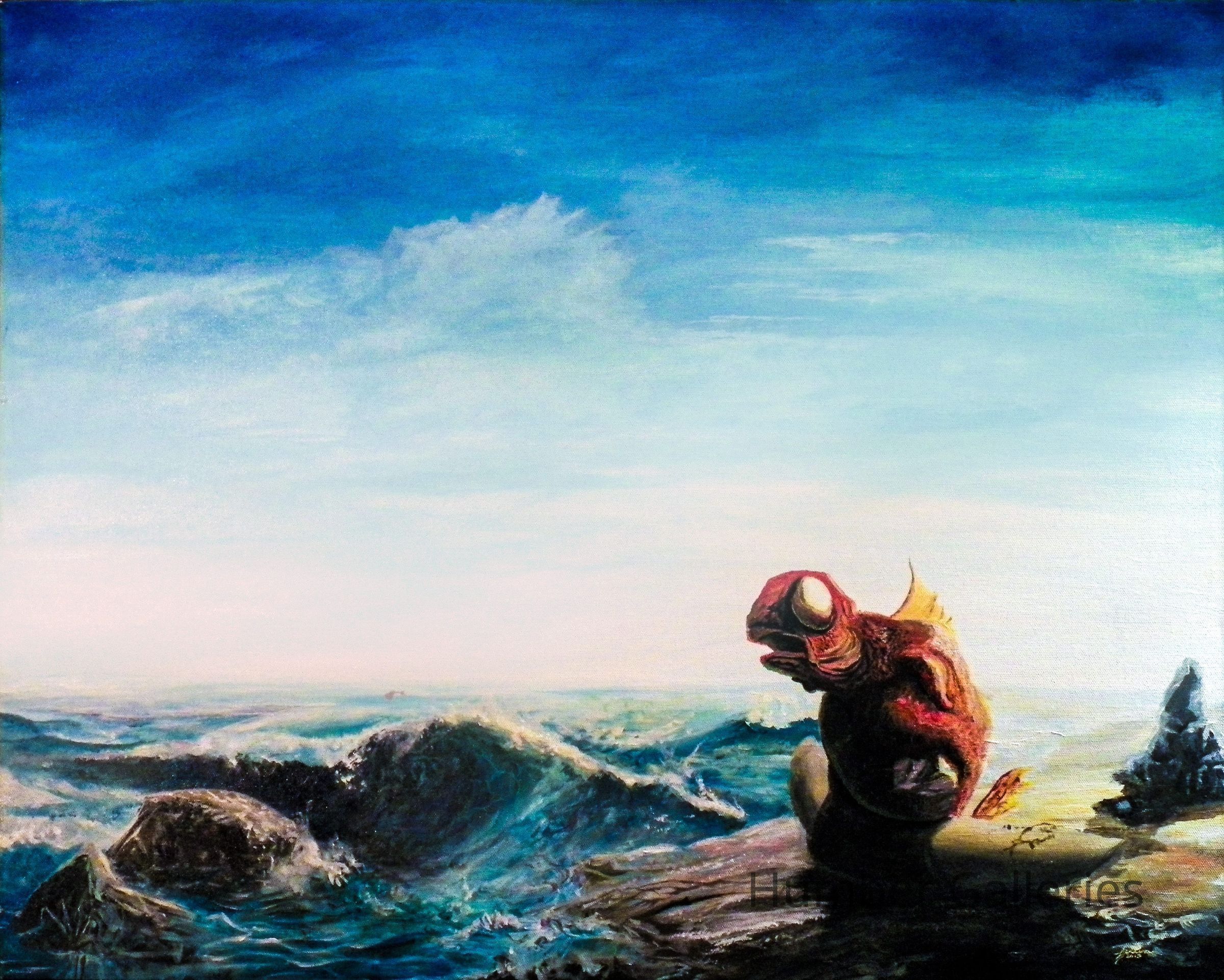 Like Lenters' other two works in the collection, this painting shows a masterful handling of vivid colours and the imagery of the natural world. The rocks and ocean are rendered in an incredibly detailed manner, contrasting with the stylized red snapper in the foreground in both colour palette and realism. The snapper figure is not immediately discernible as a fish on first glance, mainly because it appears to be sitting on dry land, creating a sense of unreality.Collection