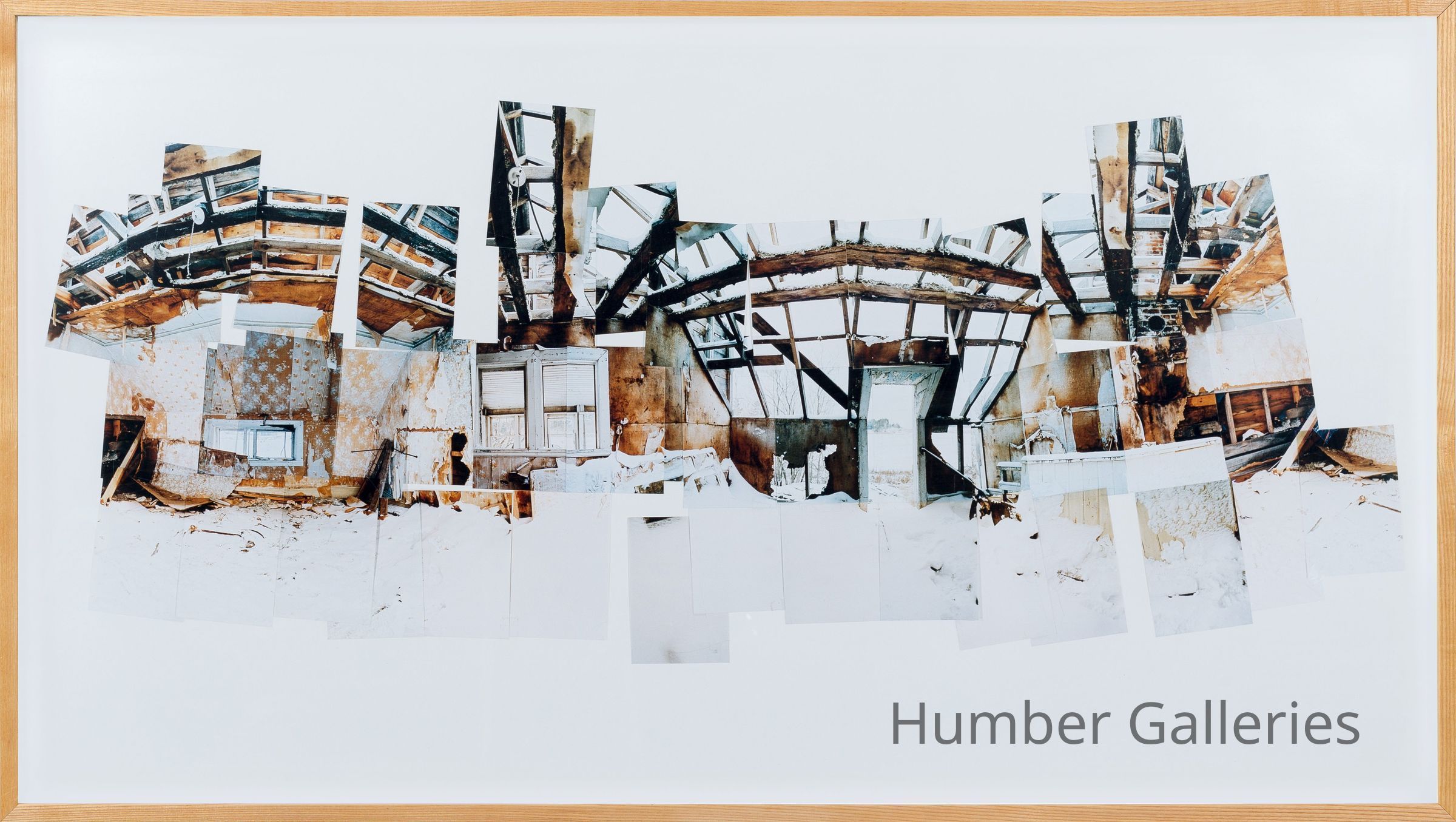 "This abstracted collage composition is composed of images of an abandoned building and the snow that has fallen through the burned-out roof. The structure of the images when reassembled gives a simultaneous sense of continuity and disorder, the architecture of the piece broken up by the gaps between the pieces of the image. The snow in the lower area of the image blends in with the white background, creating a sense of isolation. The photomontage technique used in this work is called panography or “joiners”, an artistic technique popularized by English artist David Hockney.