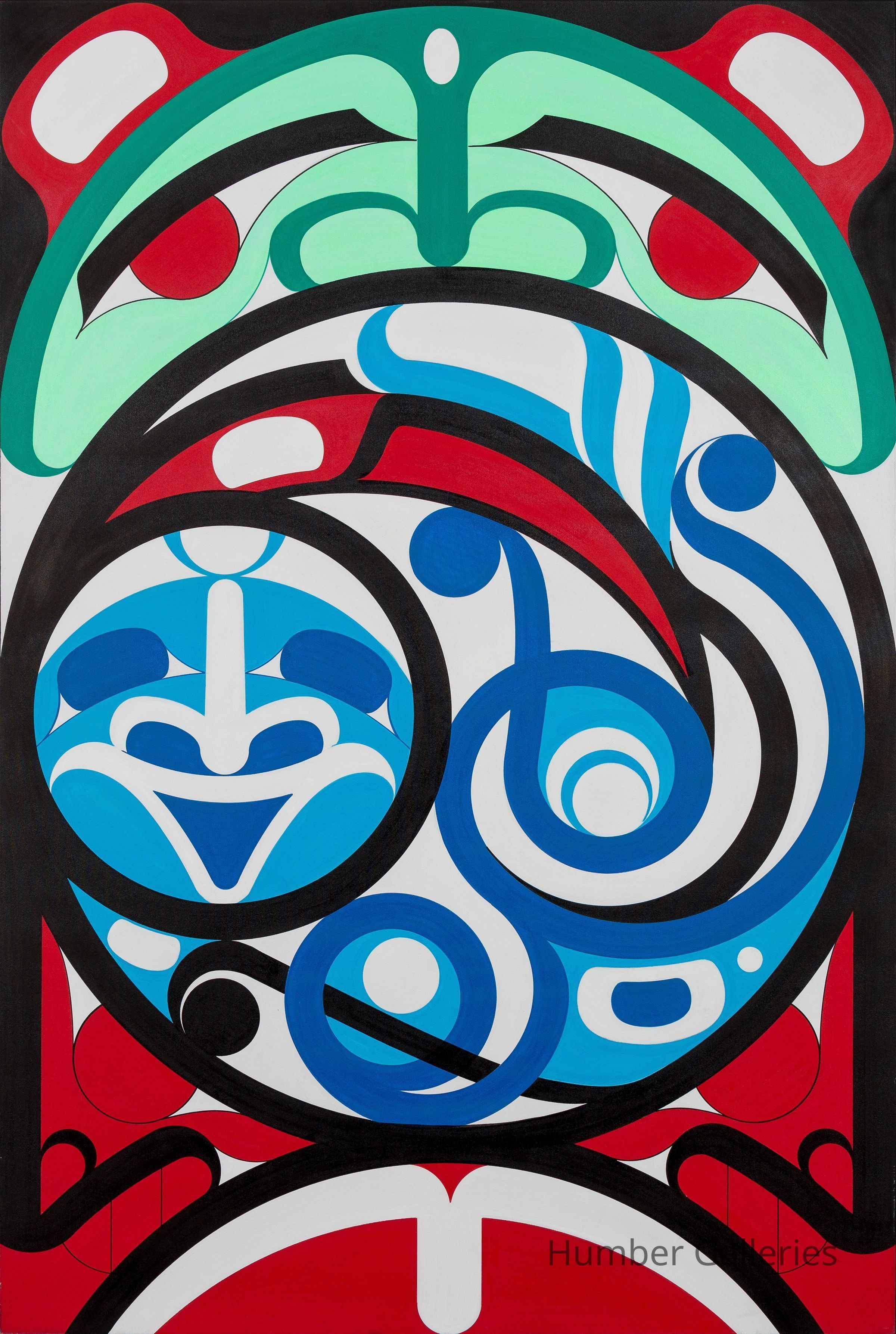Vancouver-based Nlakapamux artist Andrew Dexel is known for fusing traditional Northwest Coast formline imagery with graffiti art styles, favouring saturated colours and crisp graphic lines. As an amphibian, the frog can live in two worlds, on land and in water, a dual experience made visible in Dexel’s dynamic composition.Collection