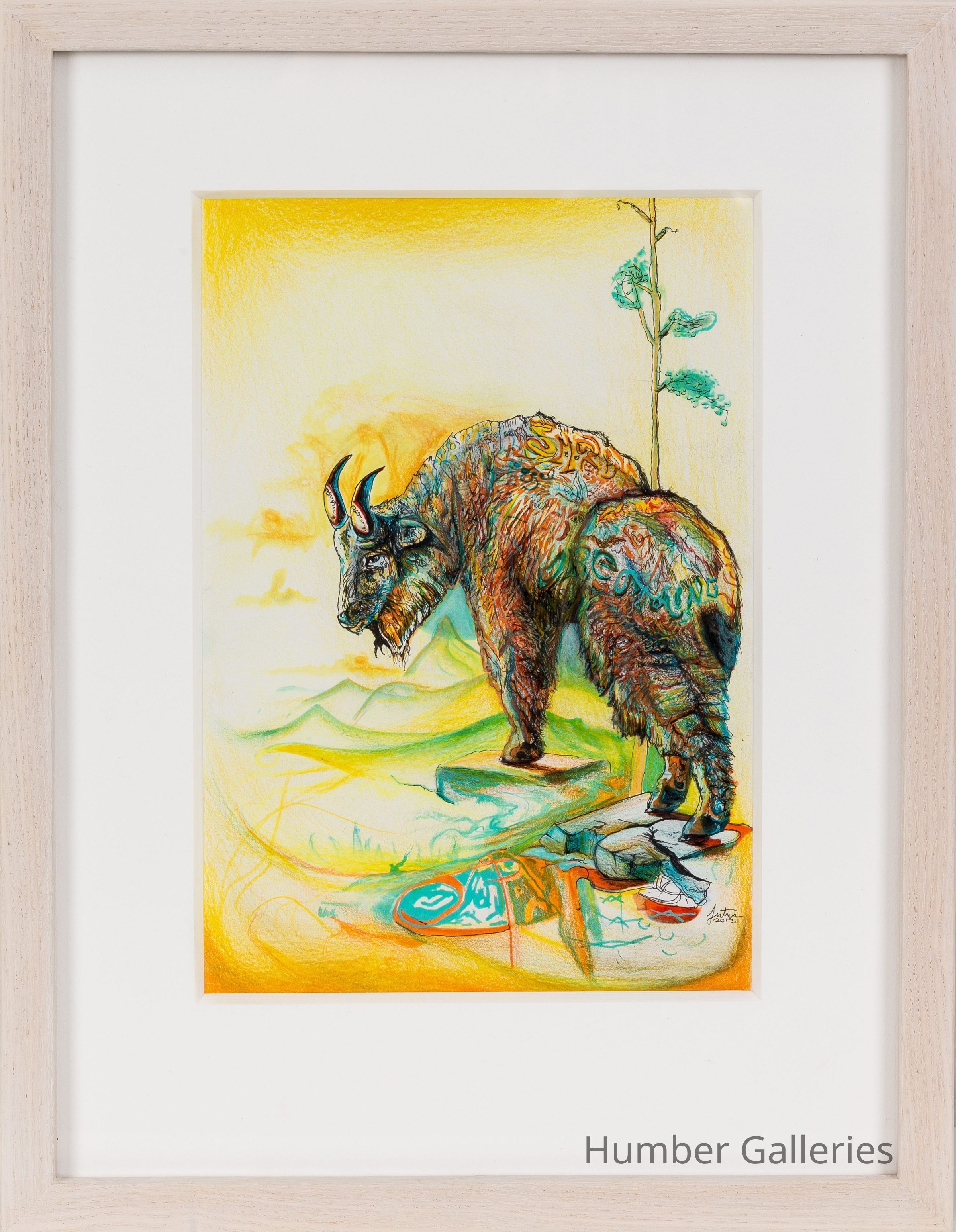 This brightly coloured drawing depicts a mountain goat patterned with abstract, sketchy designs on its fur and outlined in black ink, standing against an abstracted background of bright oranges, yellows, and greens. The use of colour and linework creates a stylized and evocative image of the animal, which appears to be the the only non-abstracted part of the image.Artwork Details