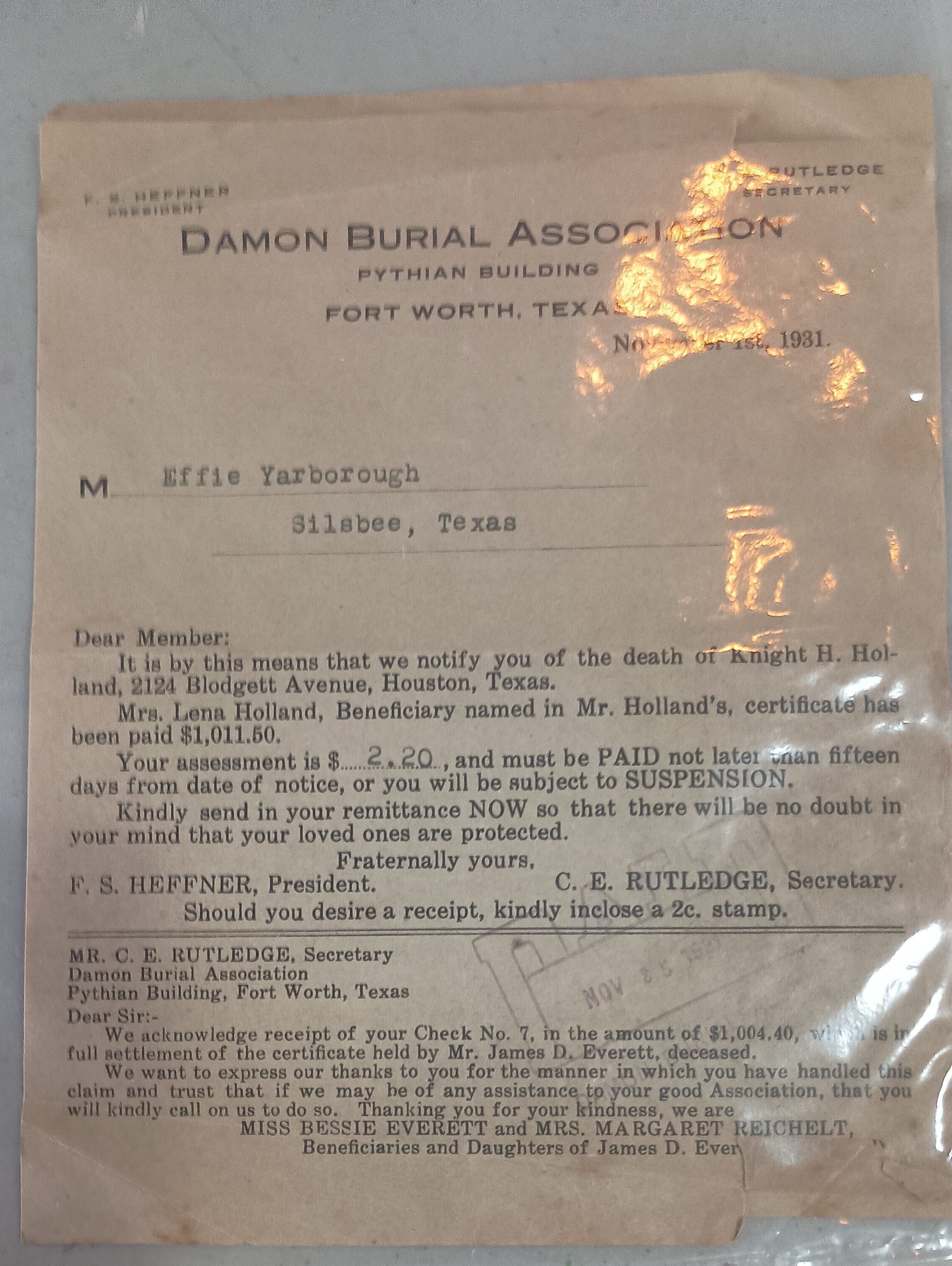 2 copies of letter to Effie Yarborough dated November 1, 1931 regarding the death of Knight H. Holbrookfeom Damian Burial AssociationTags