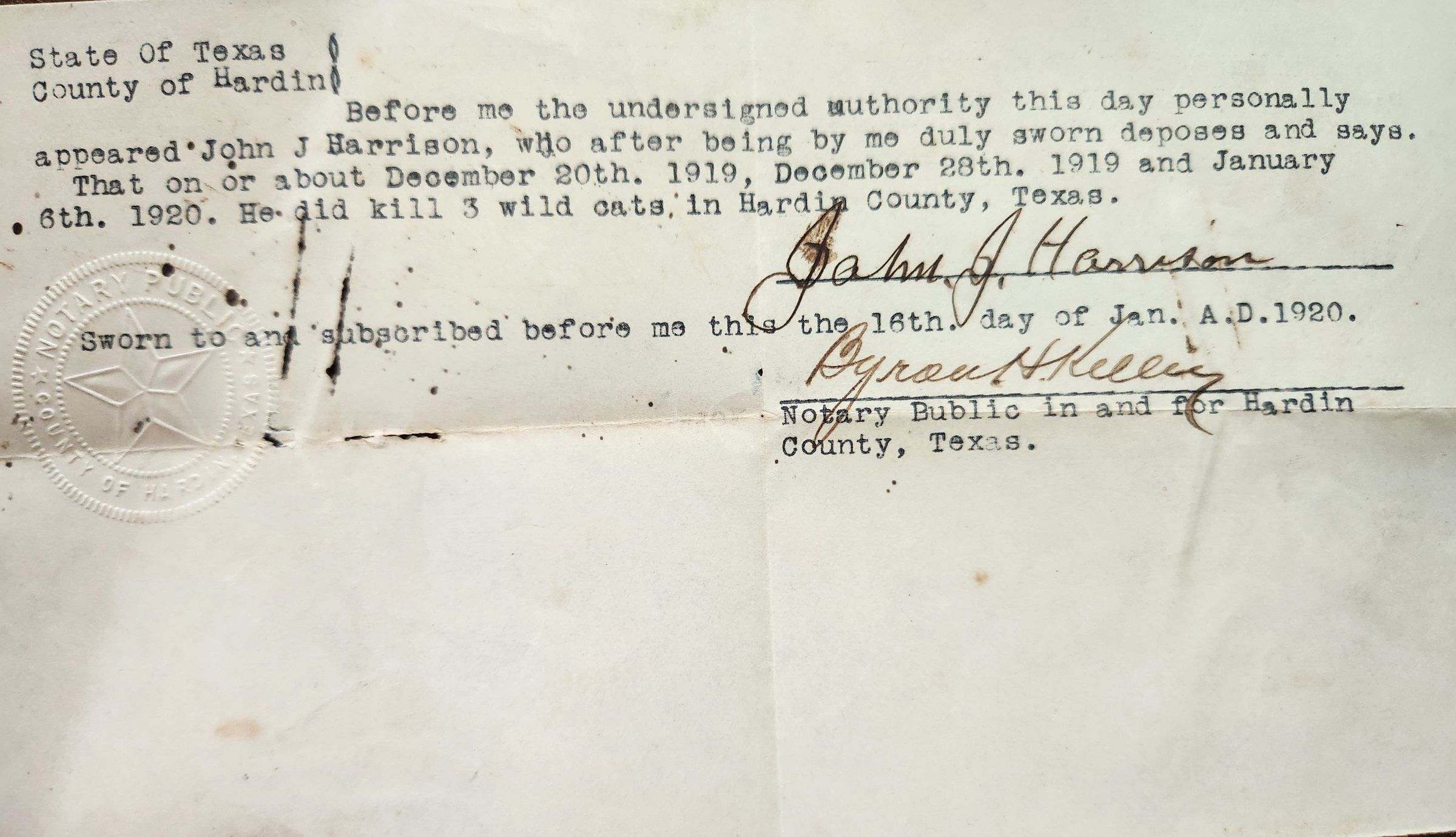Affidavit for Kill of Wild Cats by John Harrison