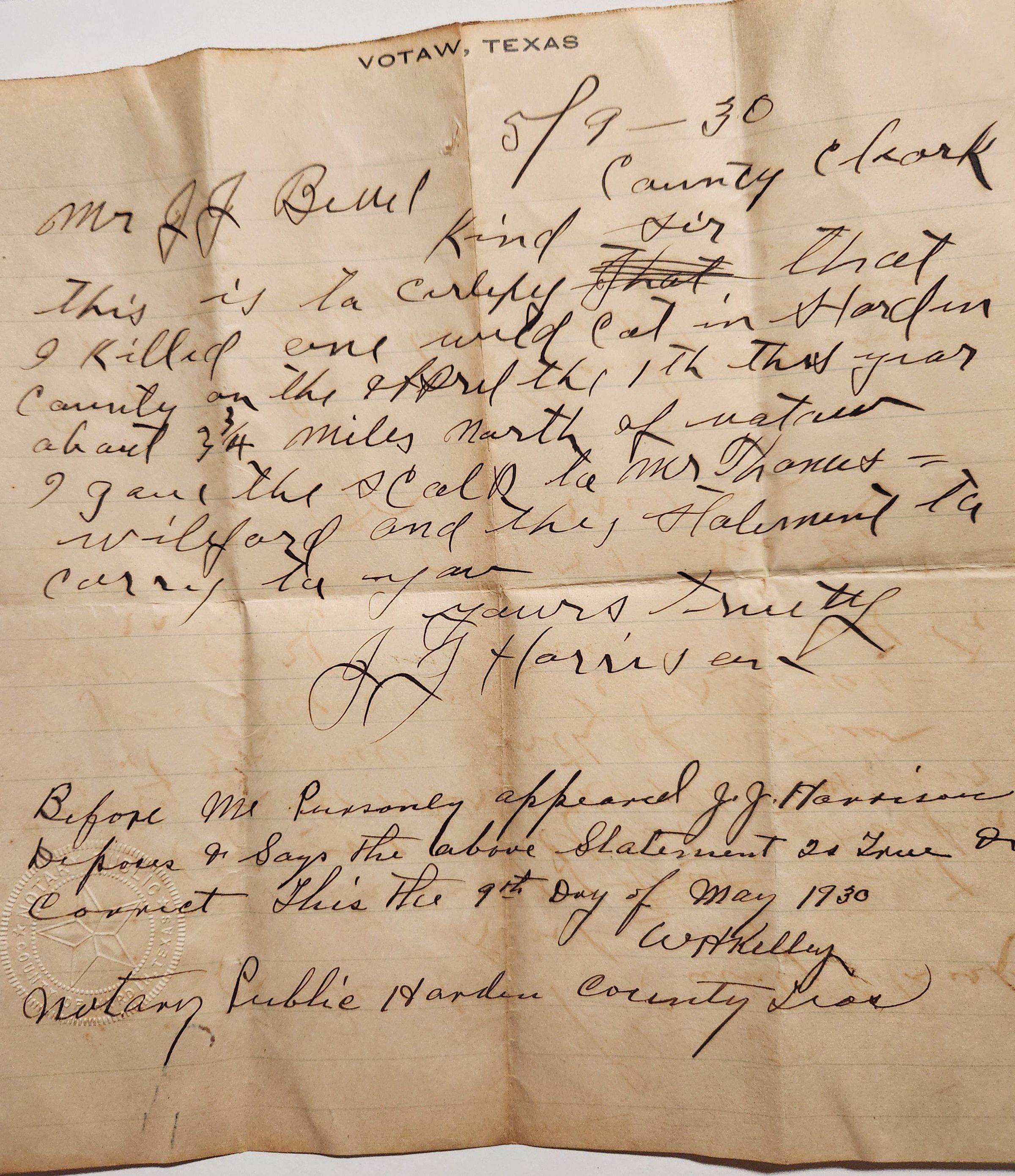Affidavit of Wild Cat Kill by J J Harrisen