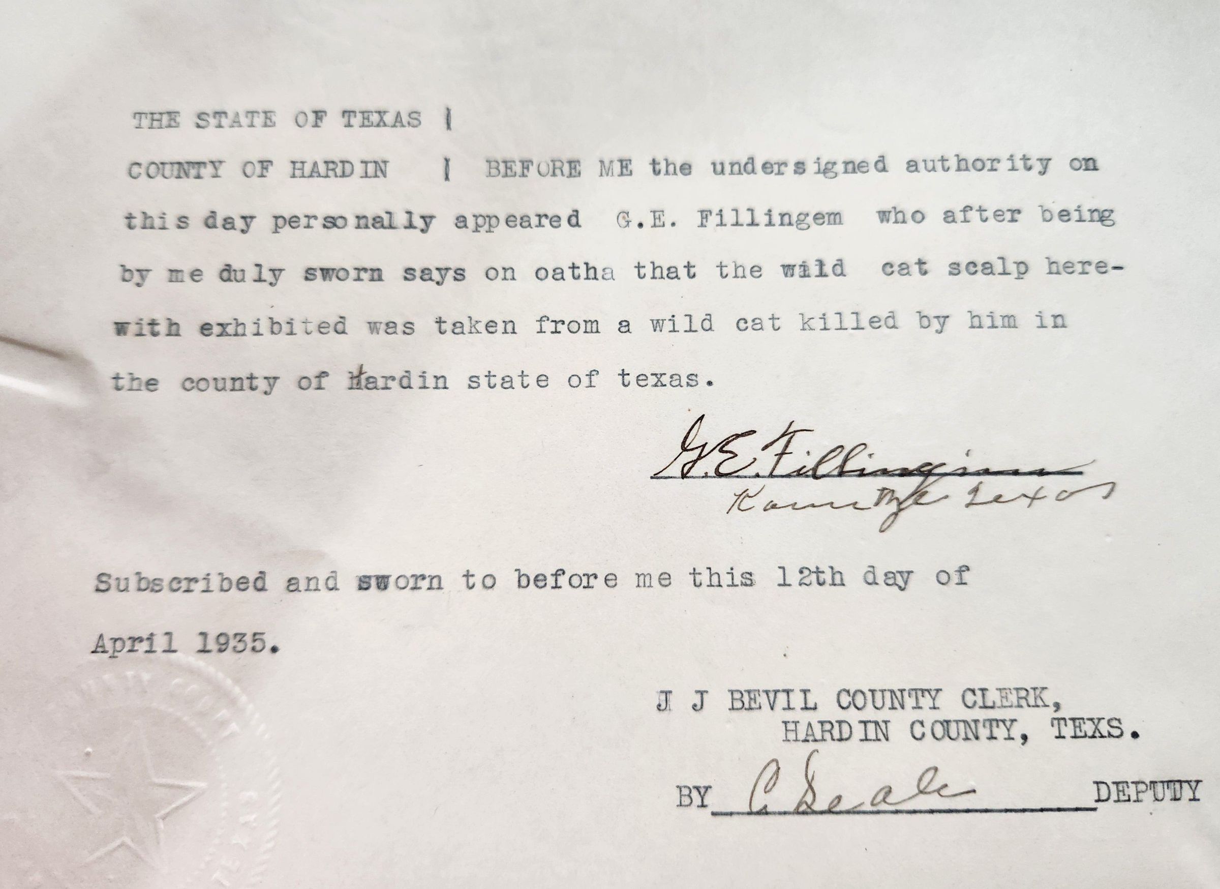 Affidavit of Wildcat Kill by G E Fillingem