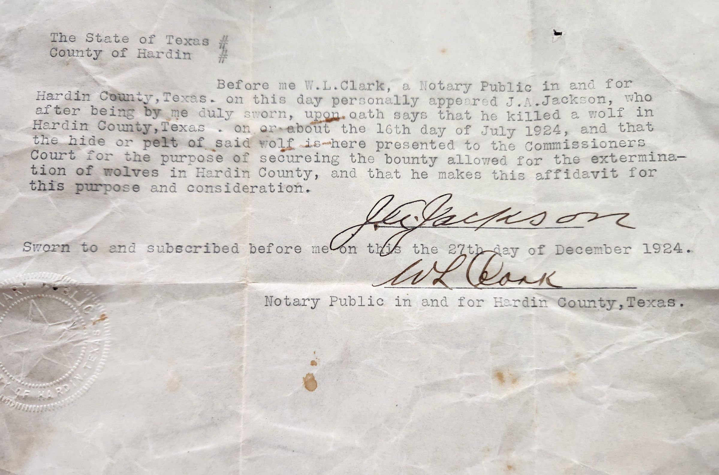 Affidavit of Wolf Kill by J A Jackson