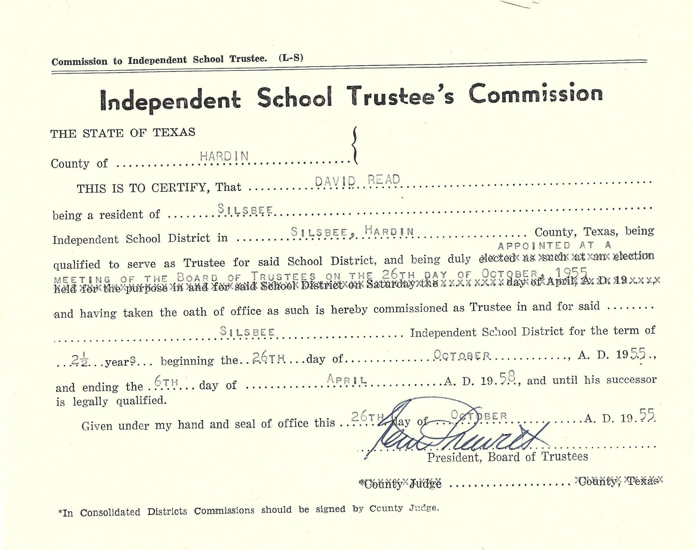 Appointment to the Independent School District of Silsbee, Texas for David Read October 26, 1955Tags