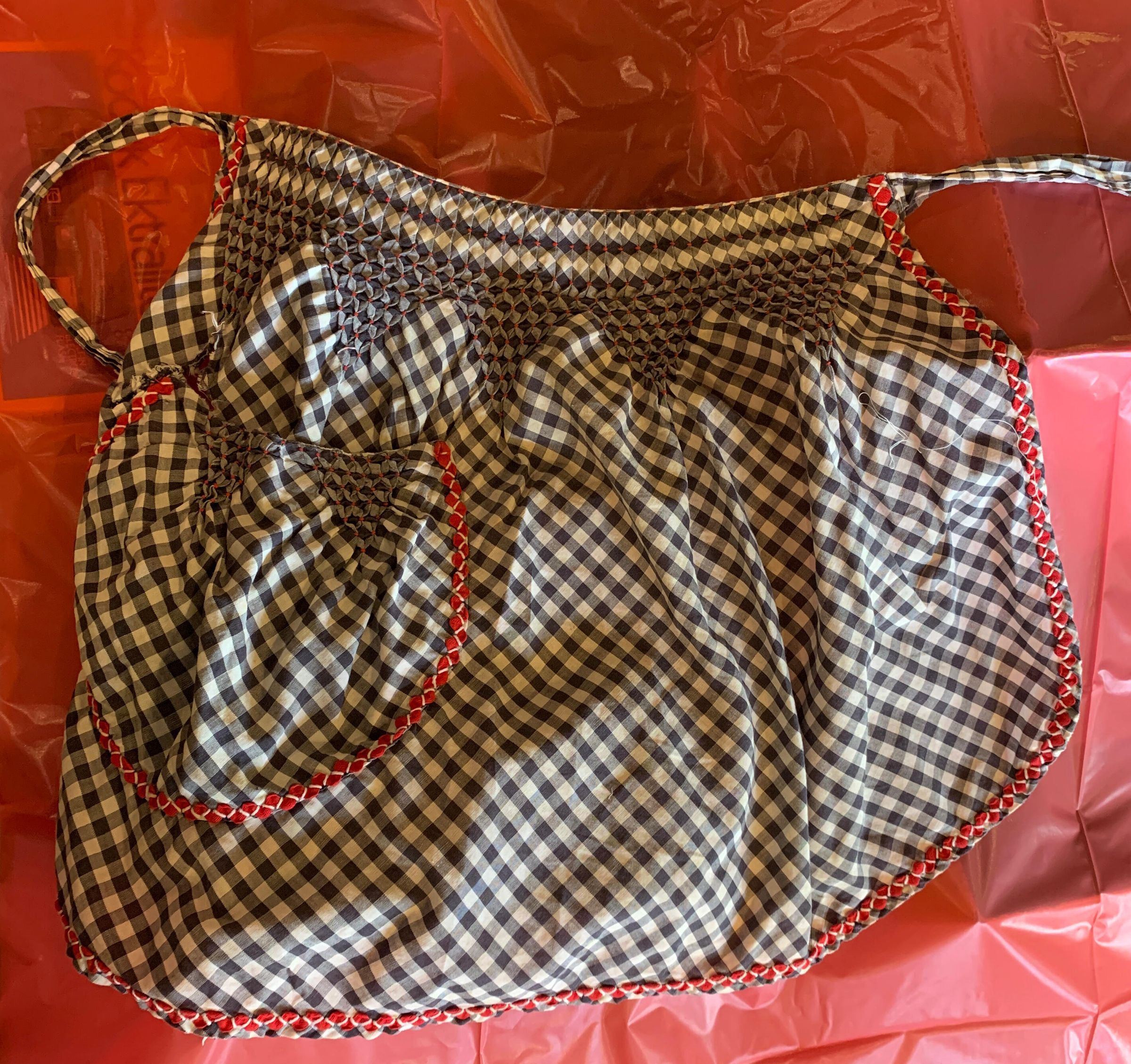 Cotton gingham material; smocking; red rick rack trim; one pocket; a rip above the pocketCollection