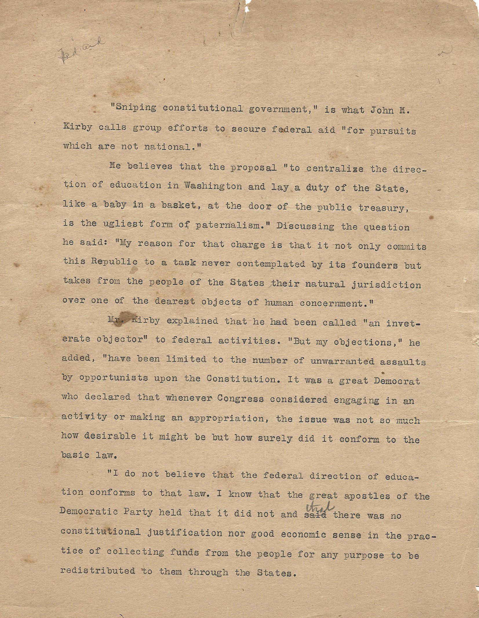 Article about John Henry Kirby beliefs about Federal Department of EducationTags