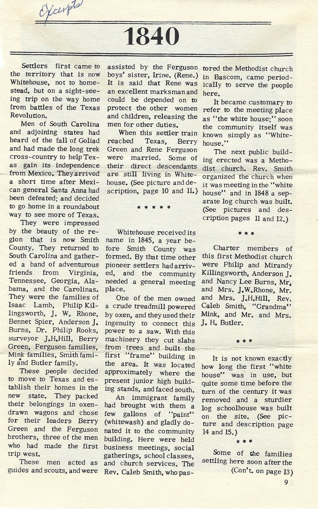 Article - Settlers from 1840 who returned home from Texas Revolution through Whitehouse, Texas then returned to settle in TexasTags