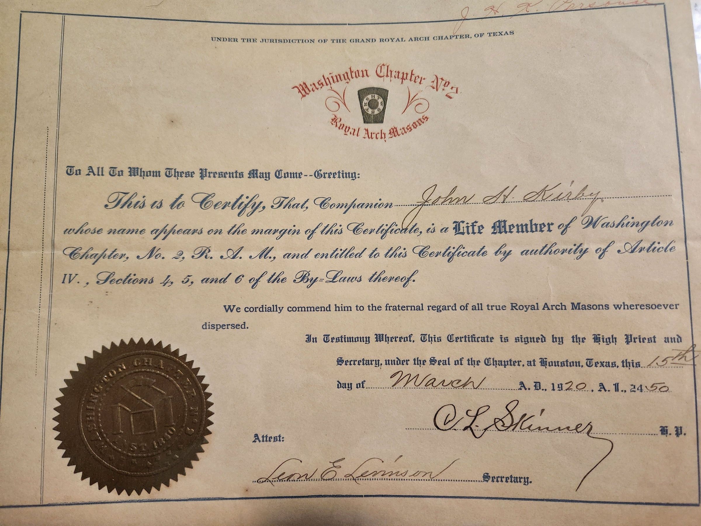 Certificate of Life Membership to the Washington Chapter Royal Arch Masons for John H Kirby dated March 15, 1920Tags
