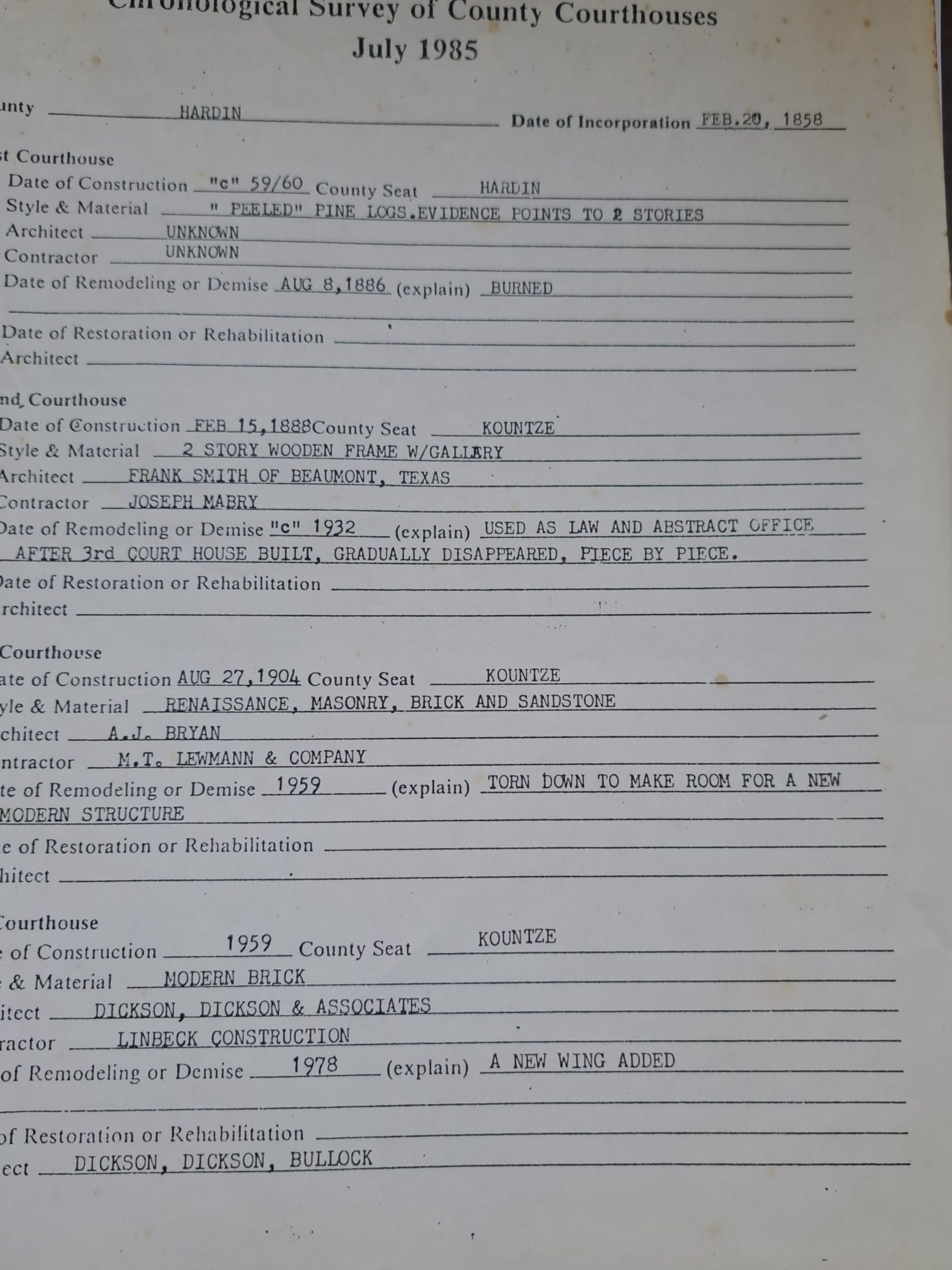 Timeline of the Hardin County Court House in Texas.Collection
