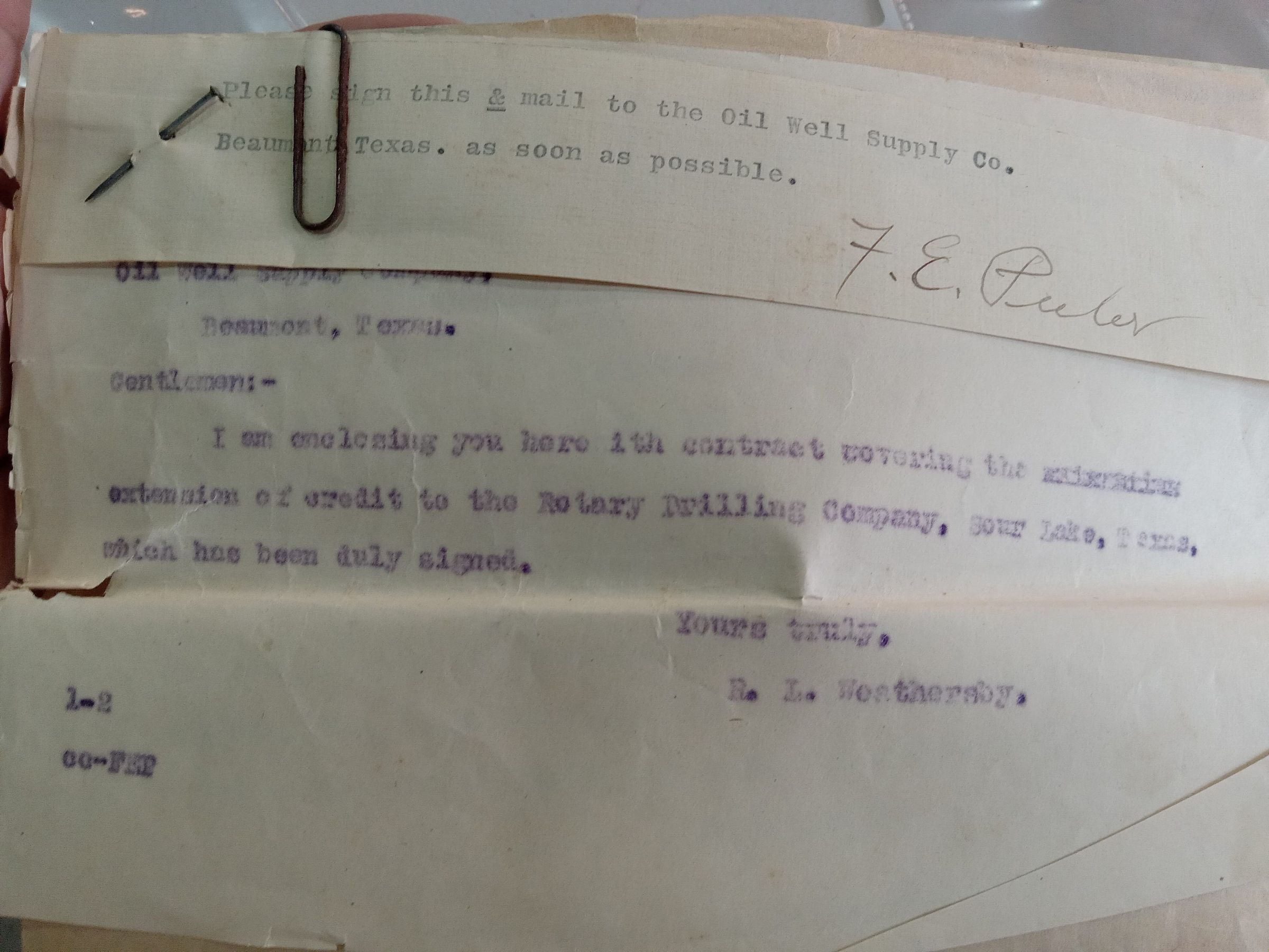 Contract covering the extension of credit to the Notary Drilling Company by R L Weathersby January 1919Tags