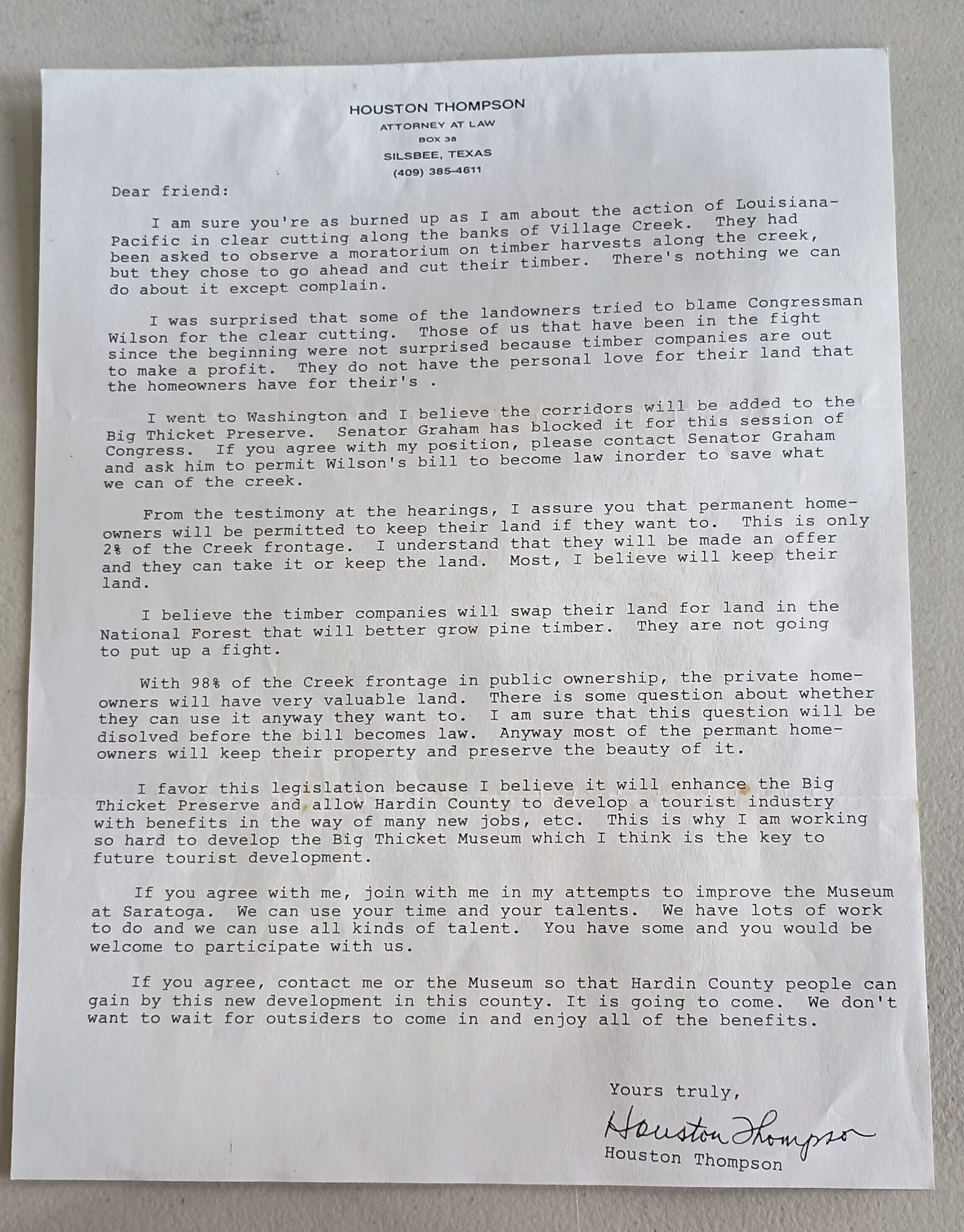 Copy of letter from Houston Thompson with no date discussing sale of property along Village CreekTags