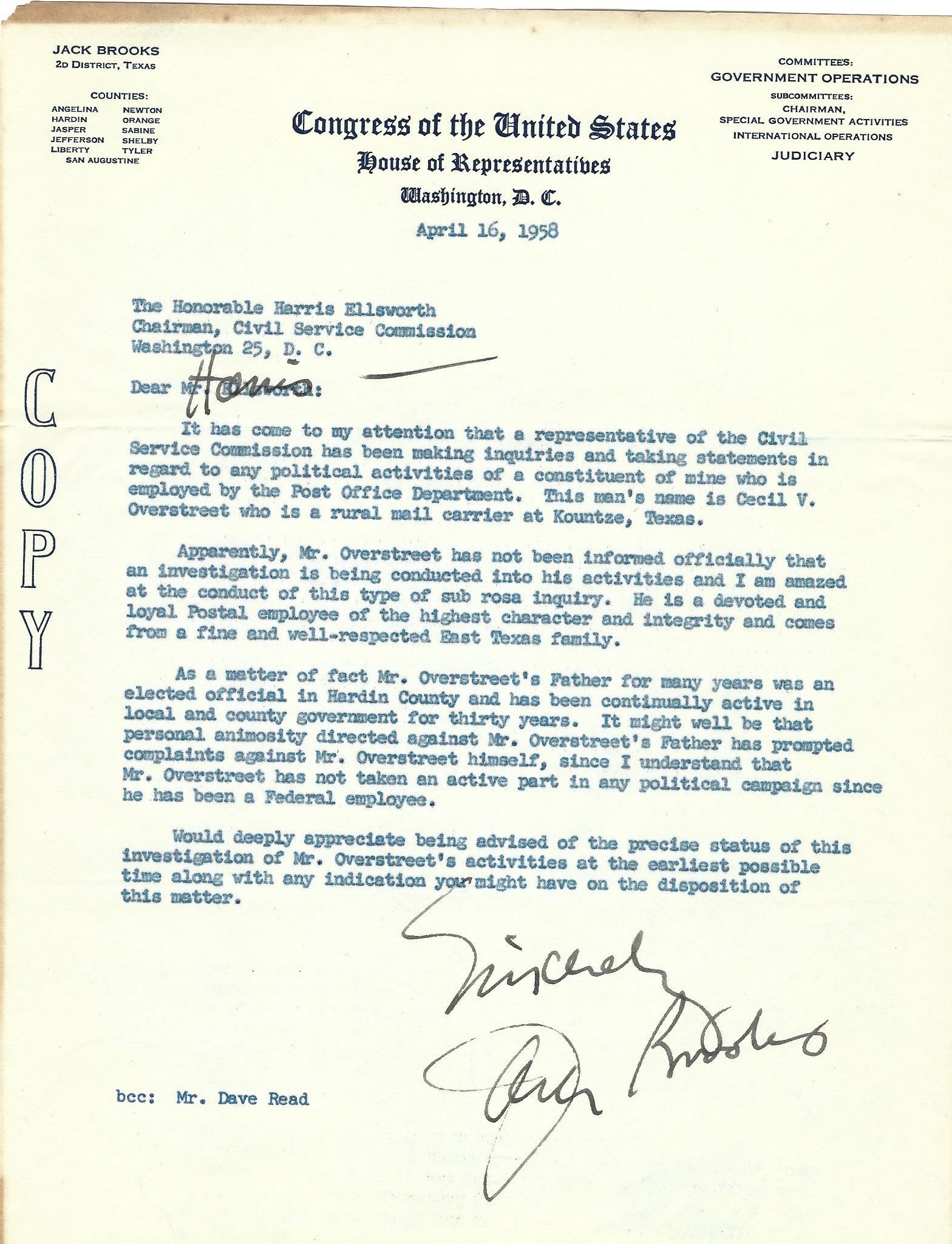 David Read, Jack Brooks, US House of Representatives, Cecil V Overstreet, Post Office, InvestigationCreated By