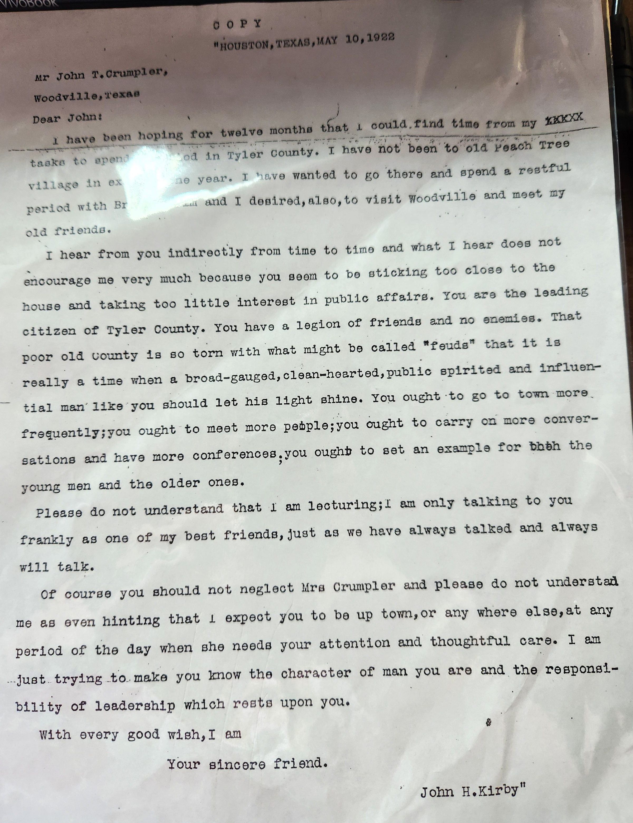 Copy of Letter to John T Crumpler from John Henry Kirby May 10,1922Tags