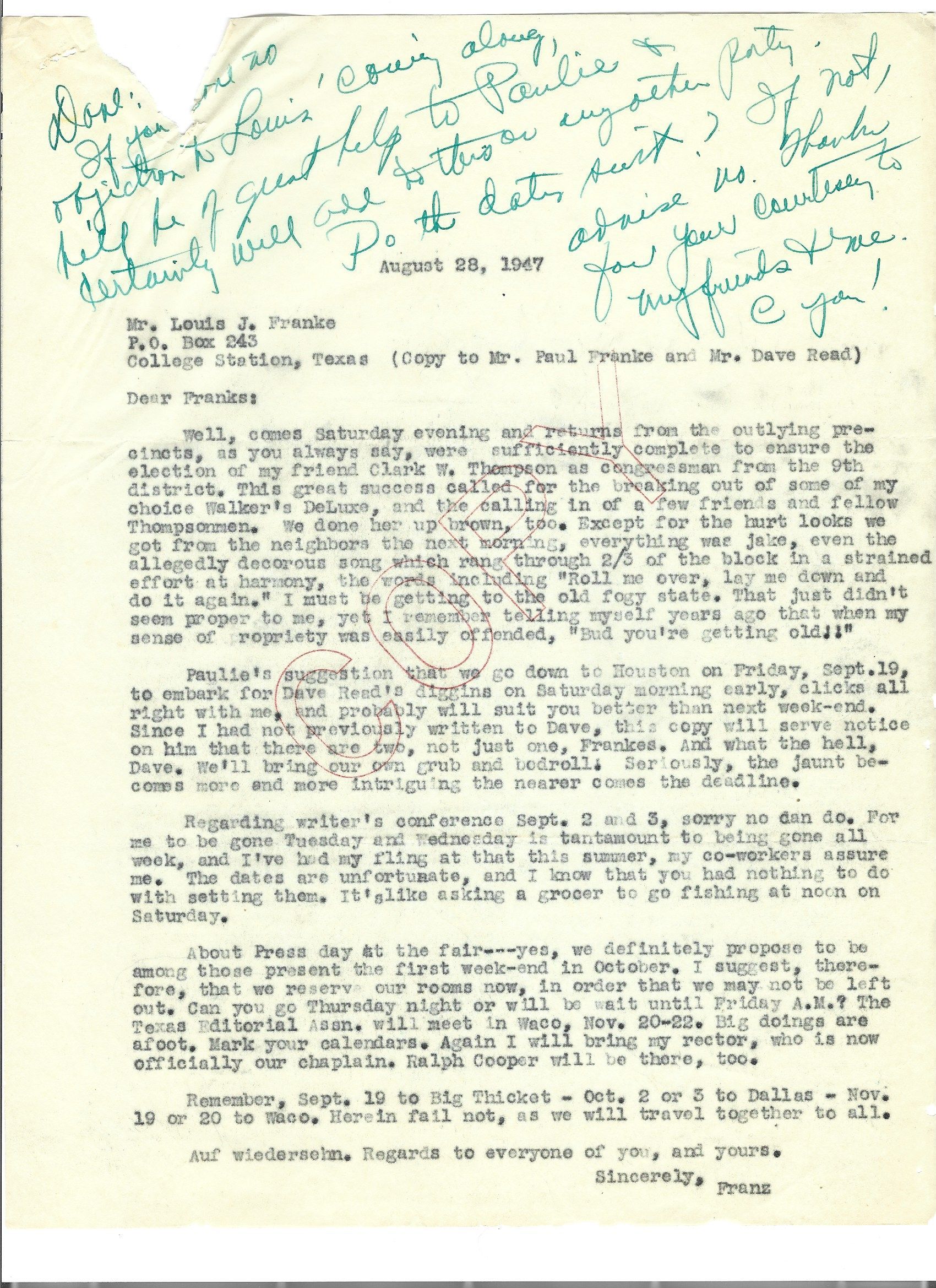 Copy of Letter to Louis J Franke from Franz - David Read Materials August 28, 1967Tags