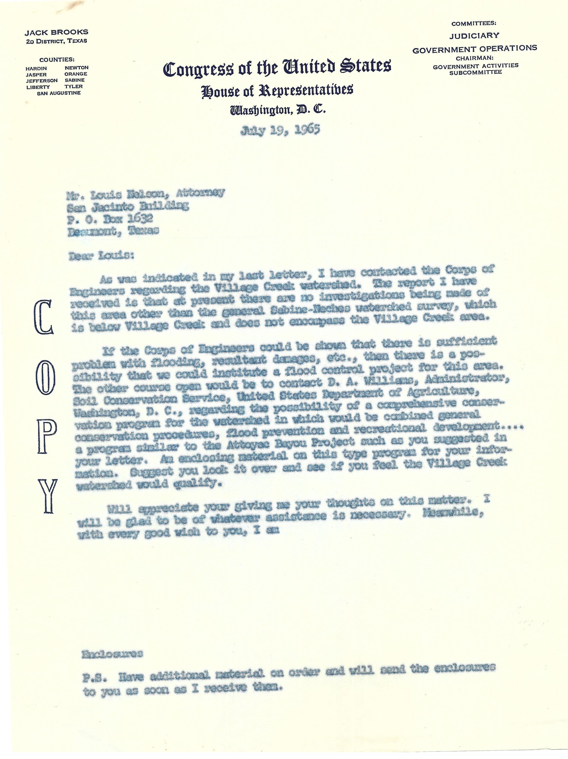 Copy of Letter to Louis Nelson from Jack Brooks July 19, 1965 regarding Village Creek WatershedTags