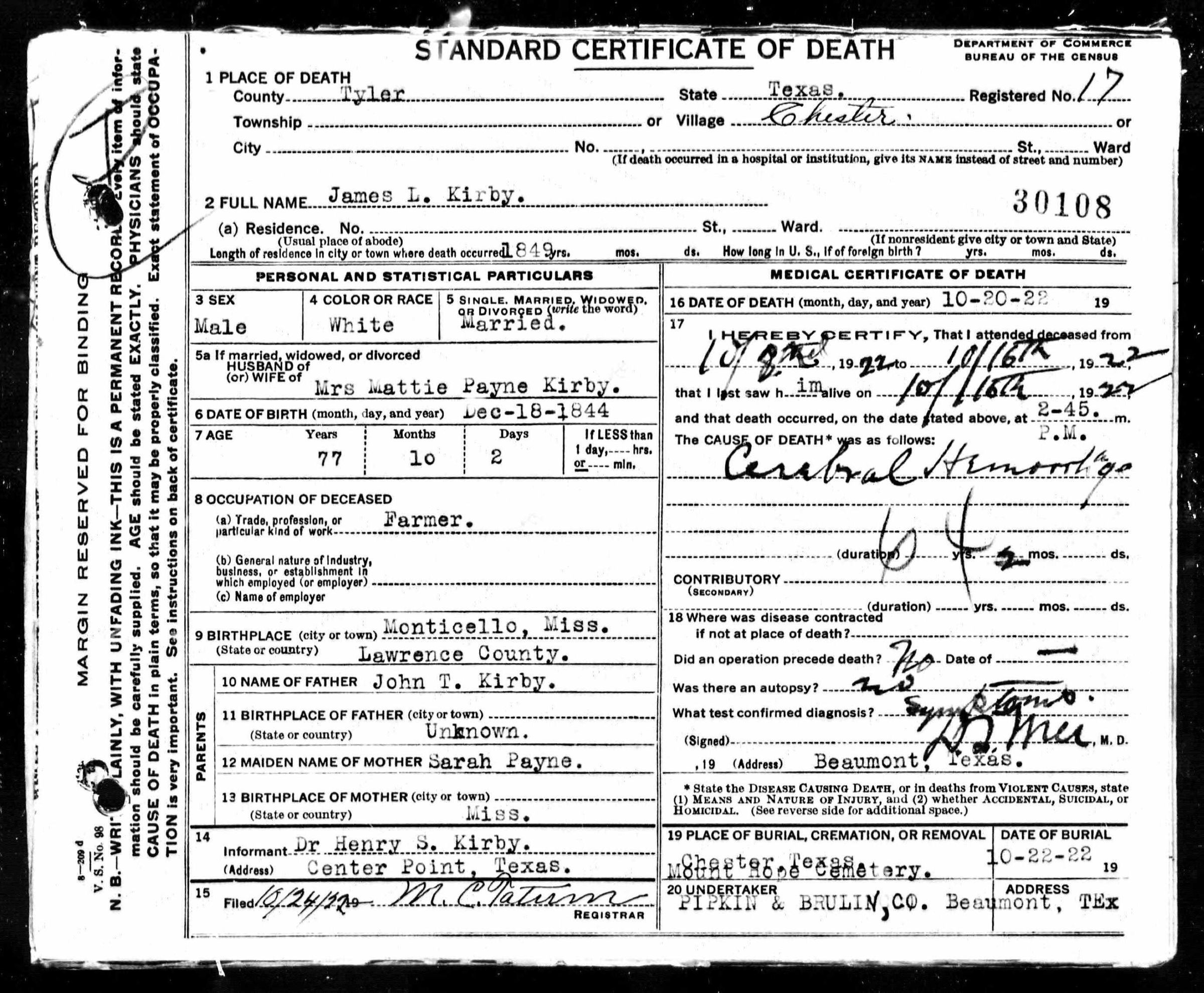 Death Certificate of James L. Kirby