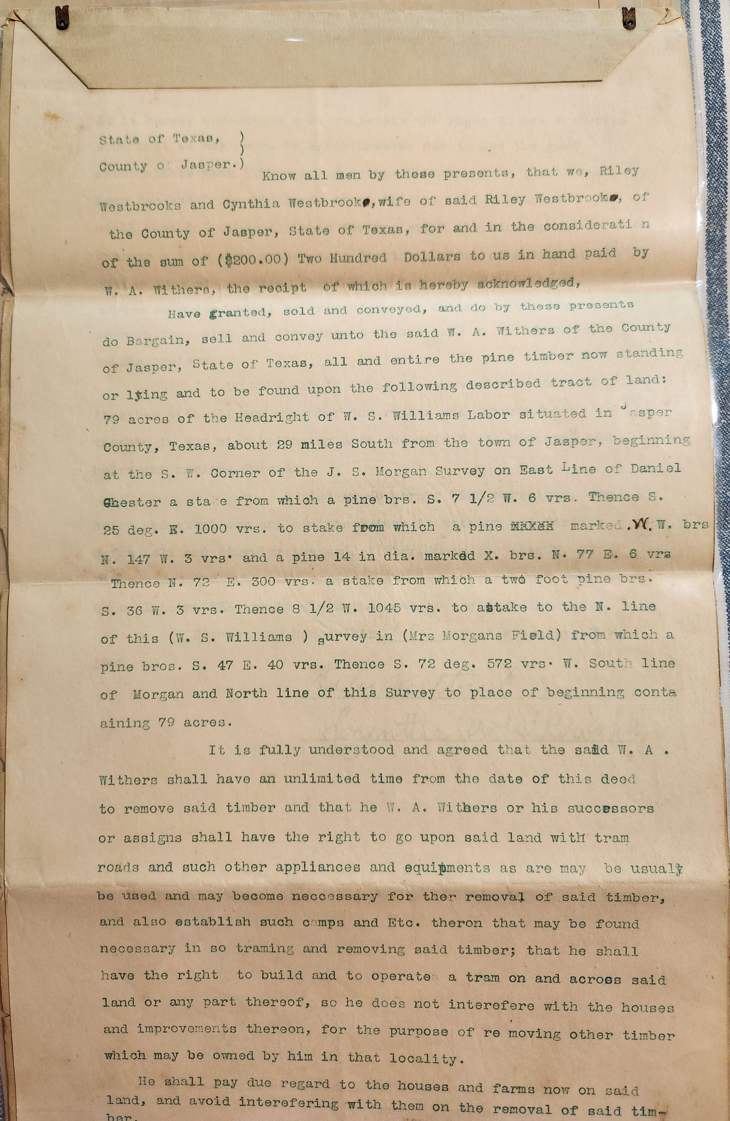 Deed for Timber Sale from Westbrook Family to W A Withers datedTags