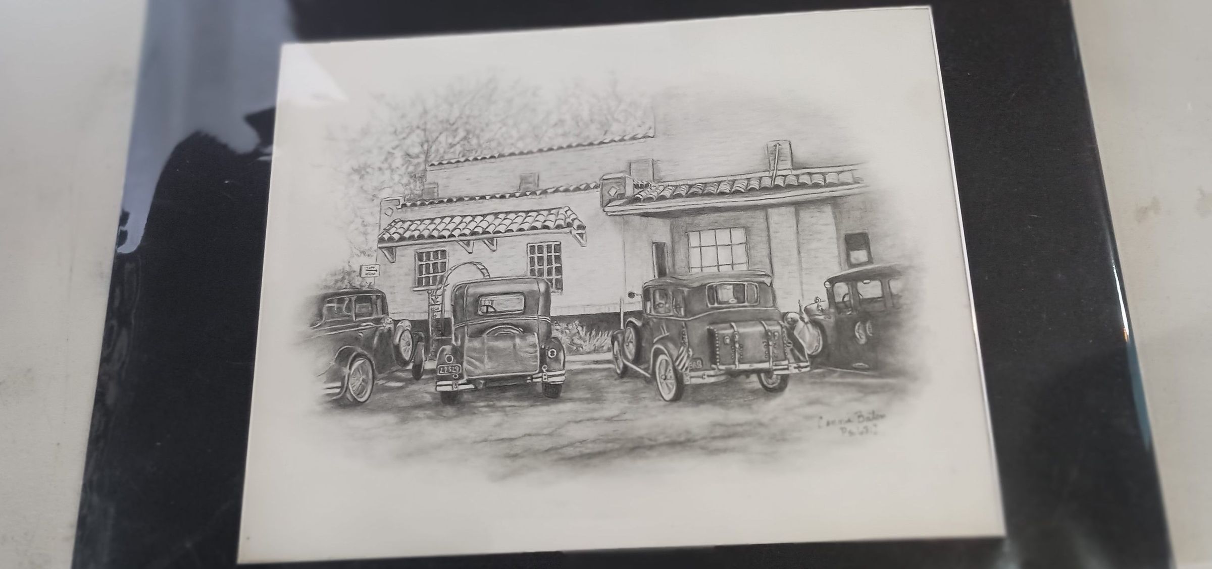 Drawing by Connie Baten with old cars of the Ice House in Silsbee, now the Ice House Museum with black matTags