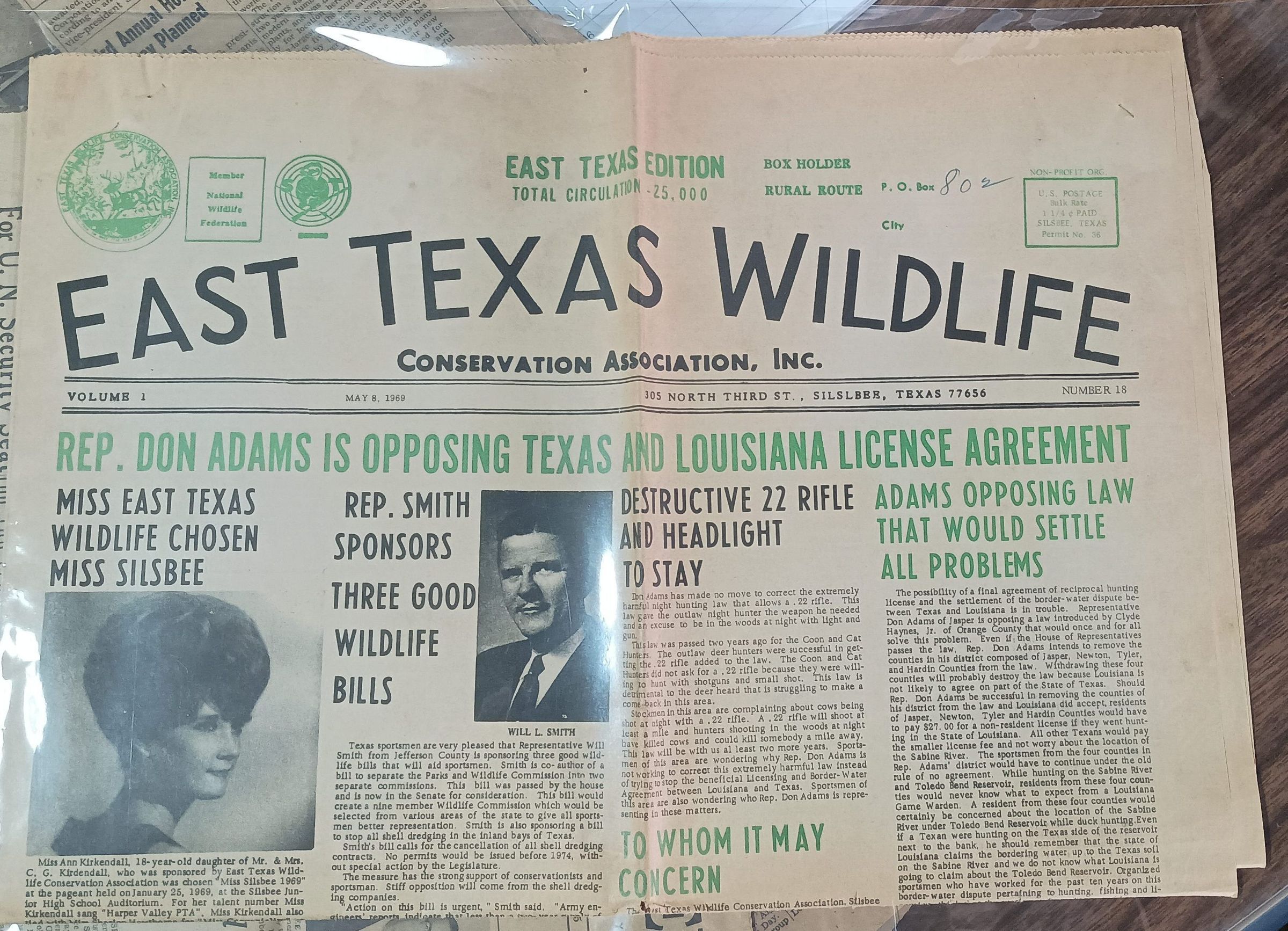East Texas Wildlife newspaper dated May 8, 1969 with headline "Rep. Don Adams is Opposing Texas and Louisiana License Agreement"Tags