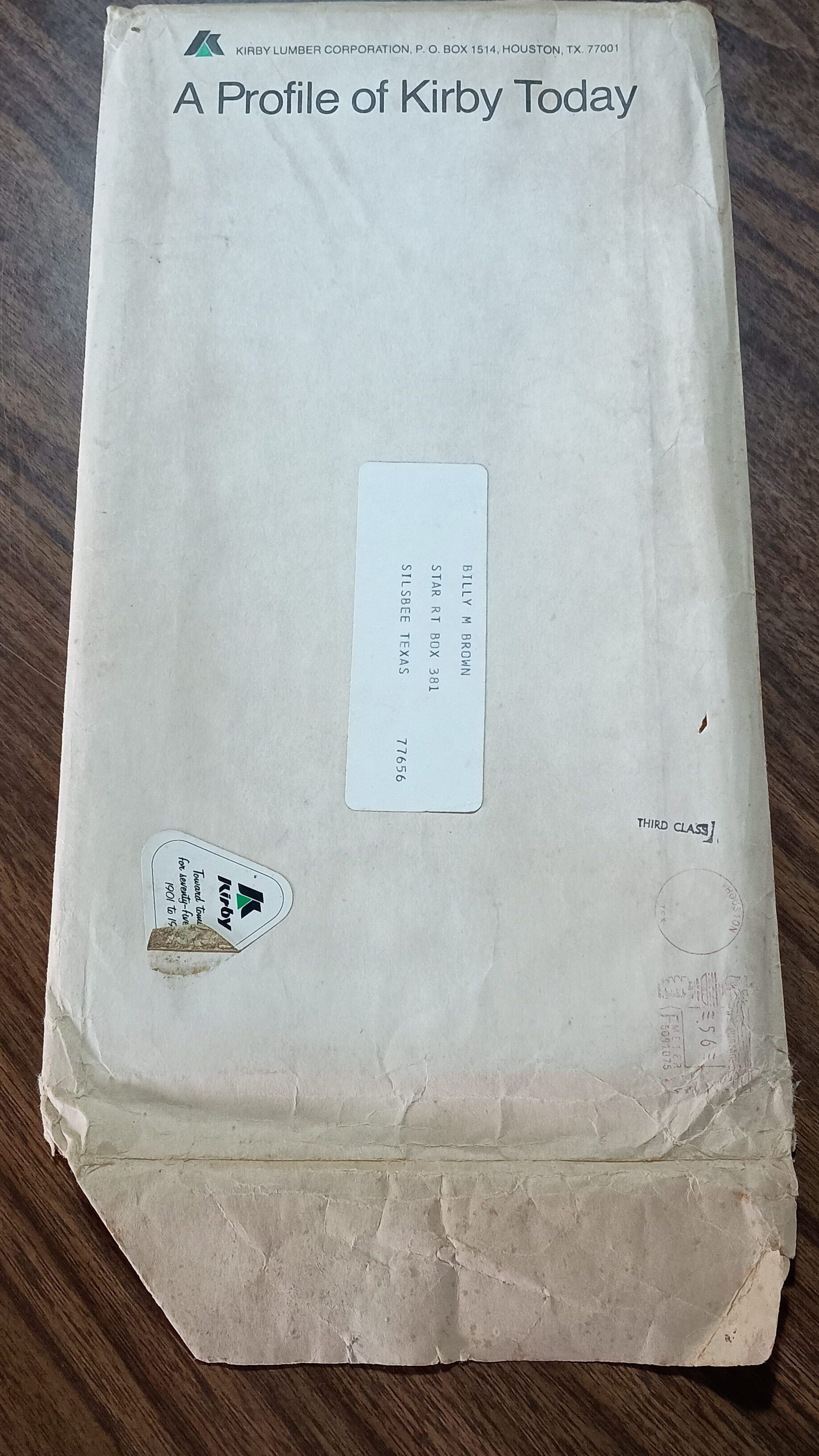 Envelope and items addressed to Billy M Brown, Silsbee Texas with items enclosed for "A Profile of Kirby Today"Created By