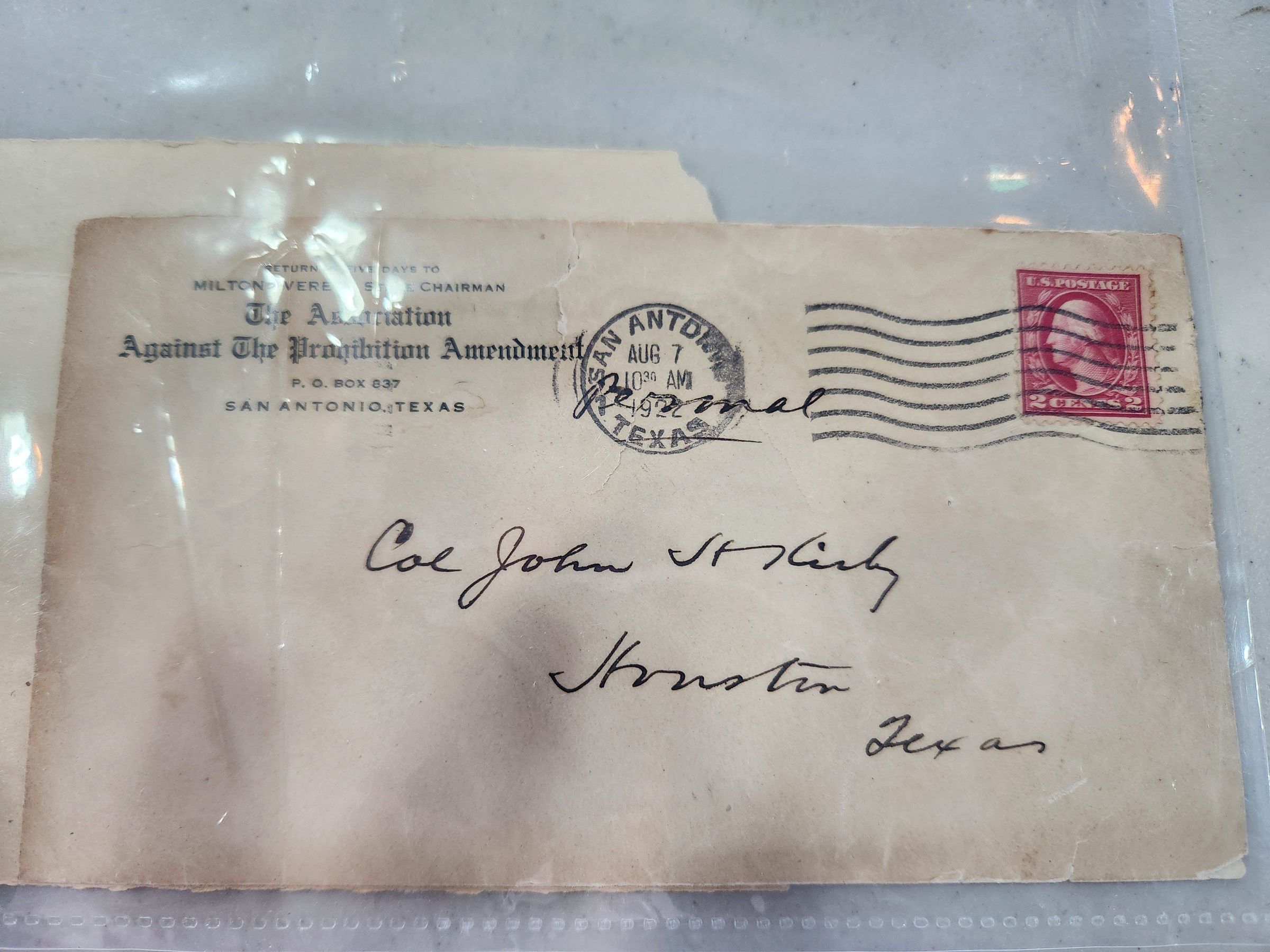 Envelope to Col John Kirby Houston, Texas from The Assoc against the Prohibition AdmendmentTags