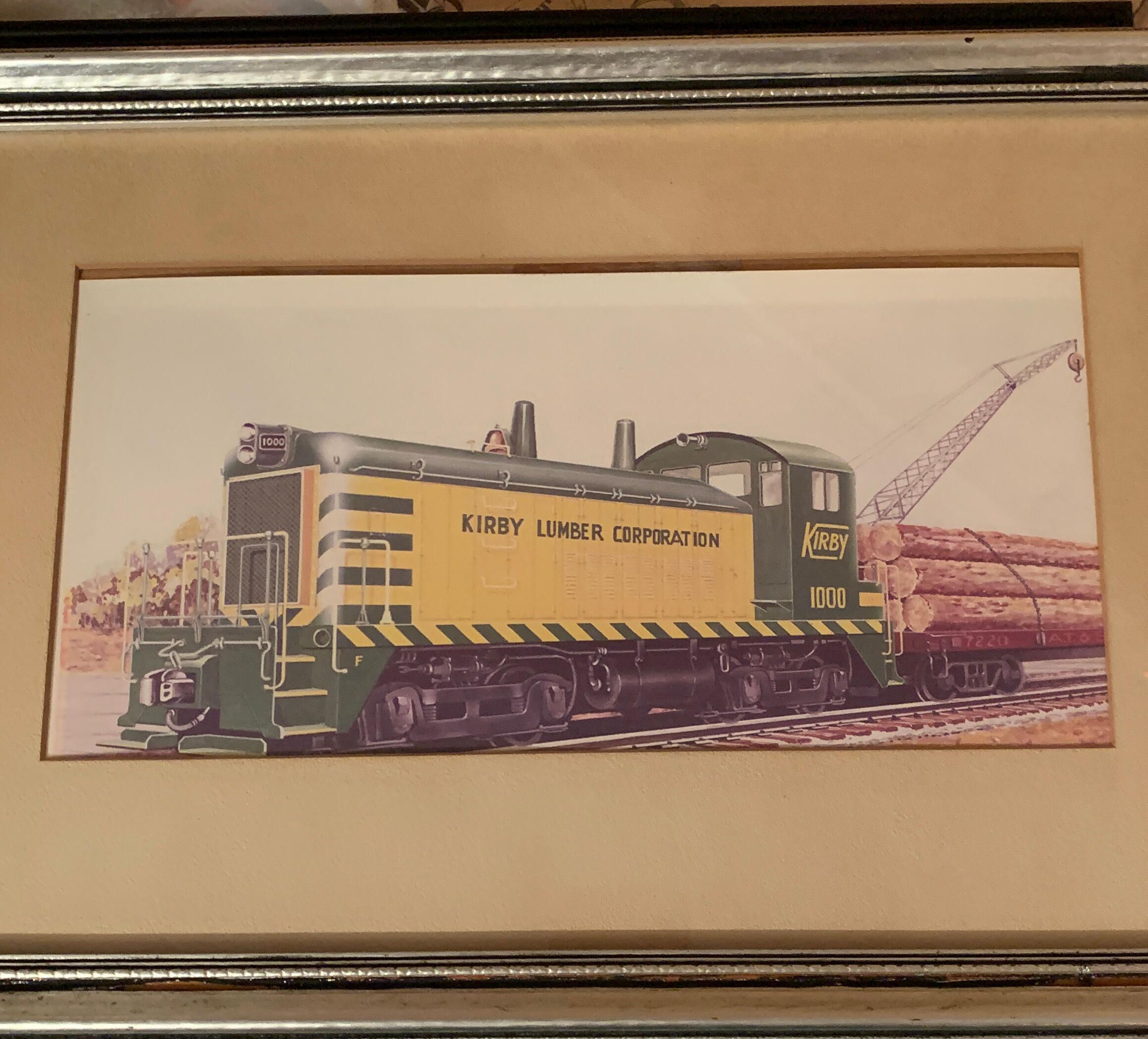 Framed Photo of a Yellow Kirby Lumber Corporation LocomotiveDescription