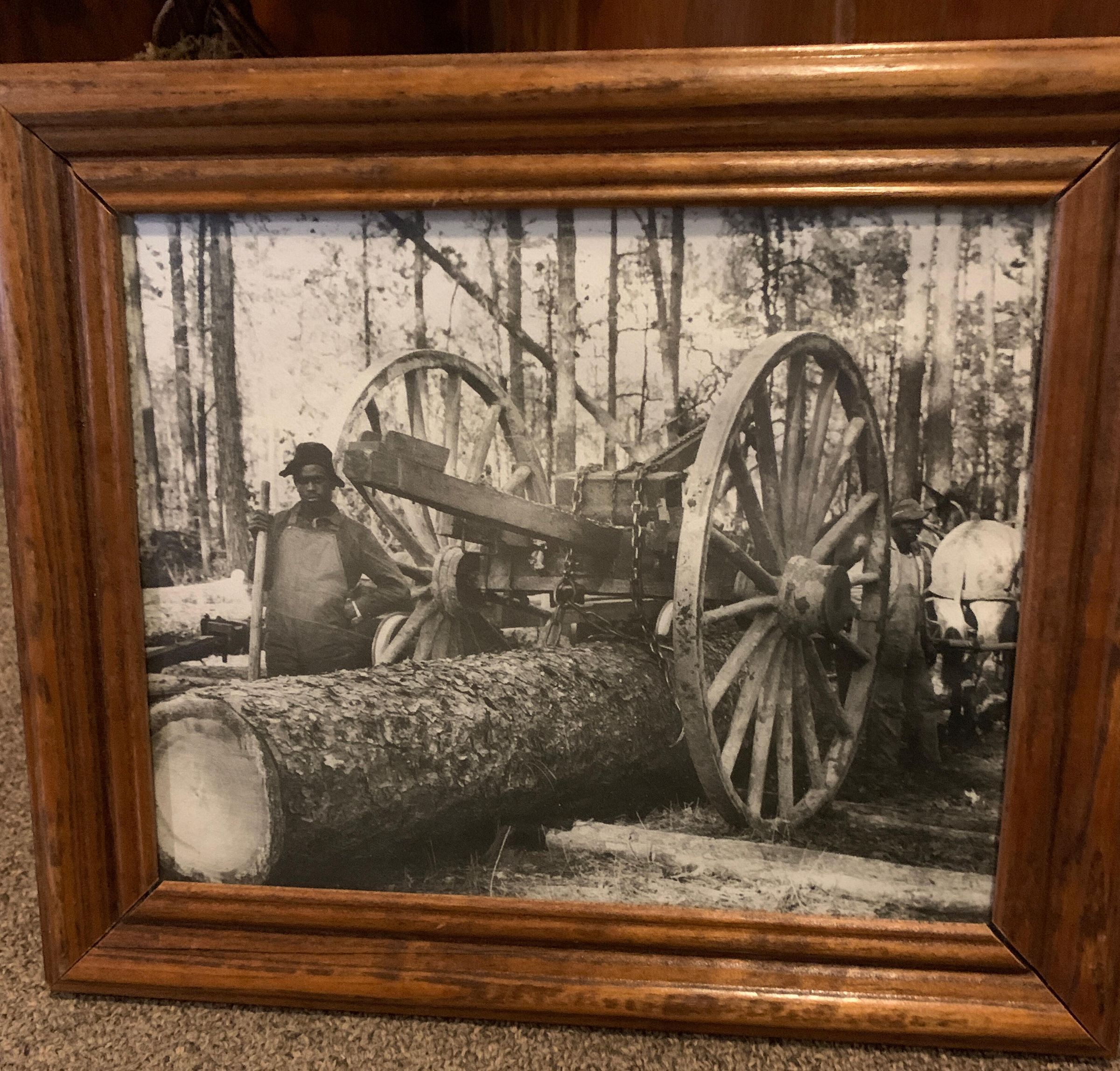 Framed Photo of Two Men With a Log Being Lifted By Horses Pulling a Cart With TongsTags