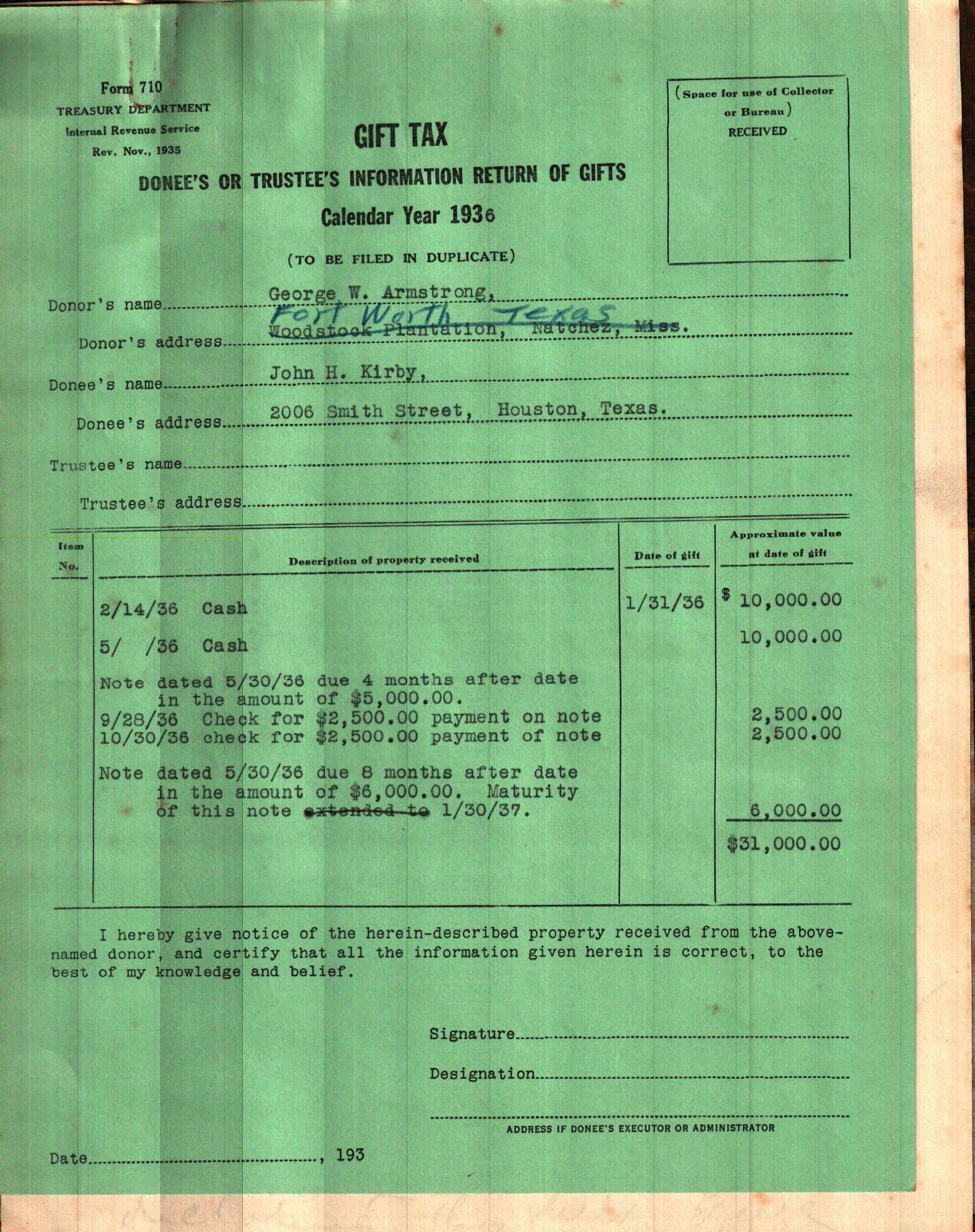 Gift Tax to John H Kirby from George W Armstrong 1936Tags