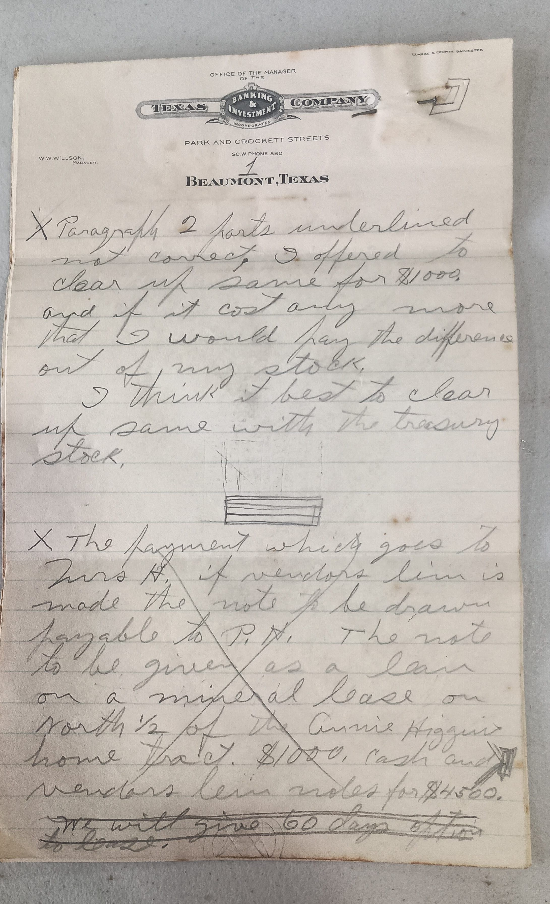 Handwritten notes regarding Higgins property in Texas Banking & Investment Company letterhead, unknown writer, no date, multiple pages still togetherTags