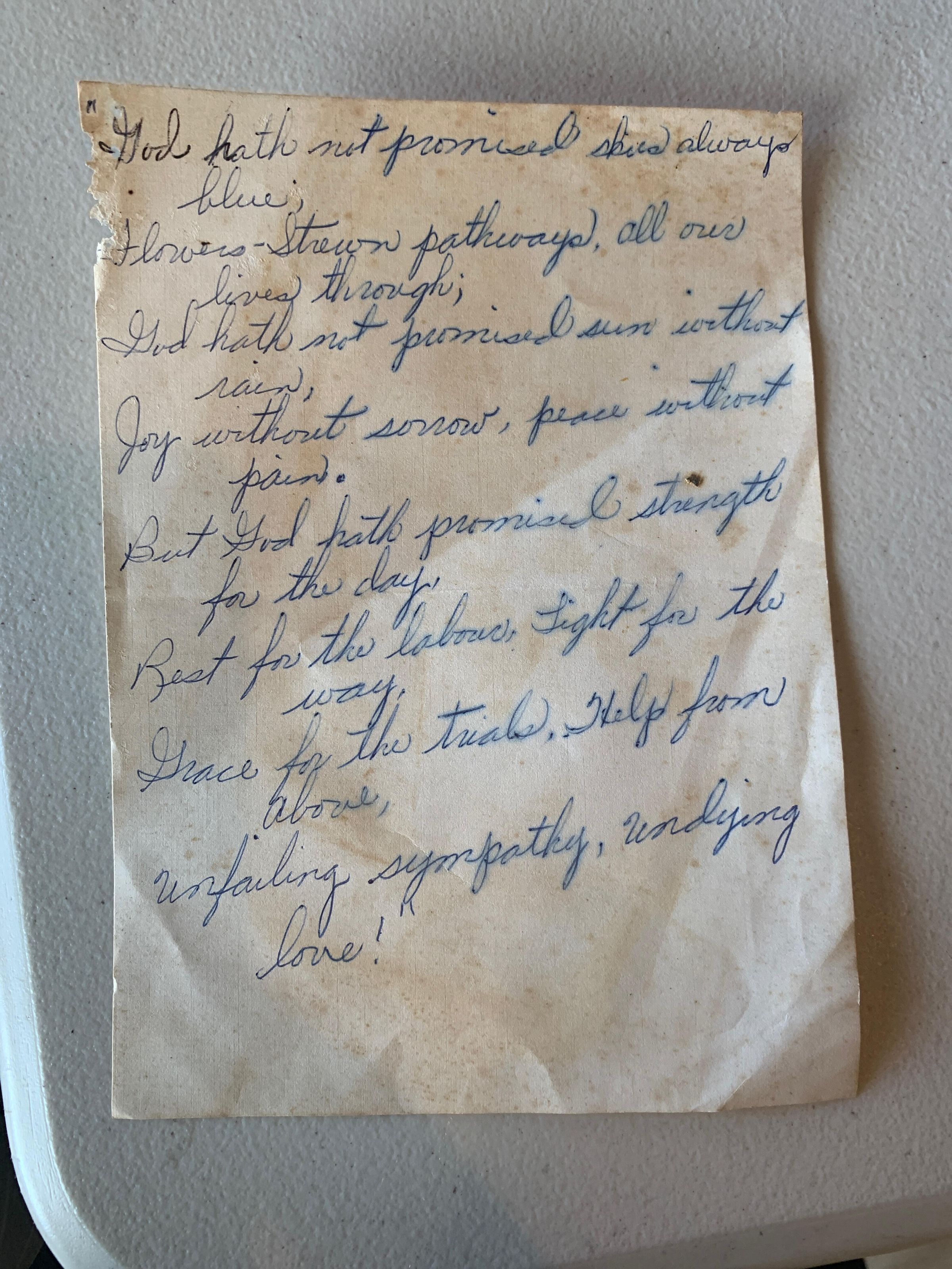 Handwritten Poem - God hath not promised skies always blue.......Tags