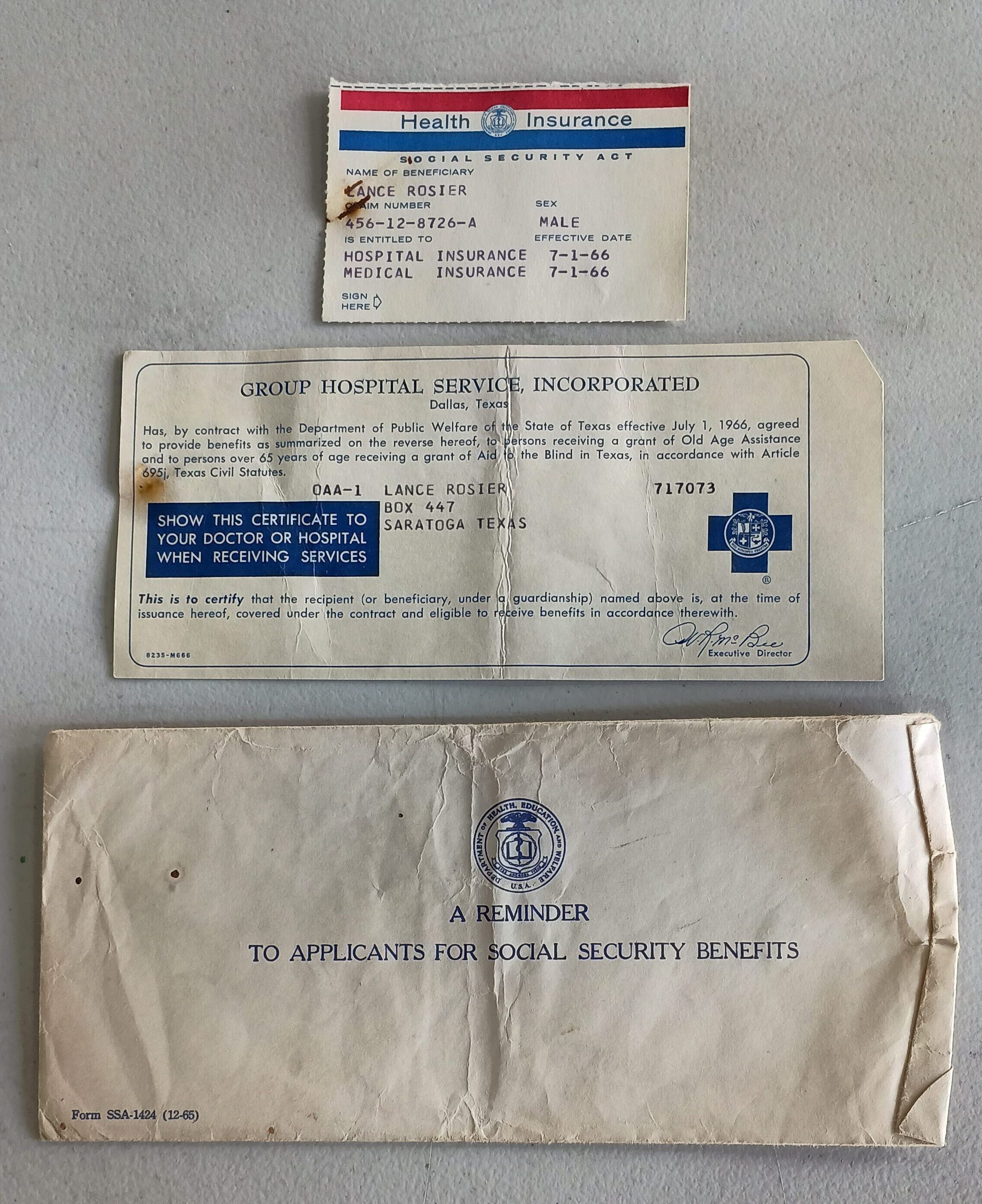 Health Insurance cards and envelope issued to Lance Rosier dated July 1, 1966