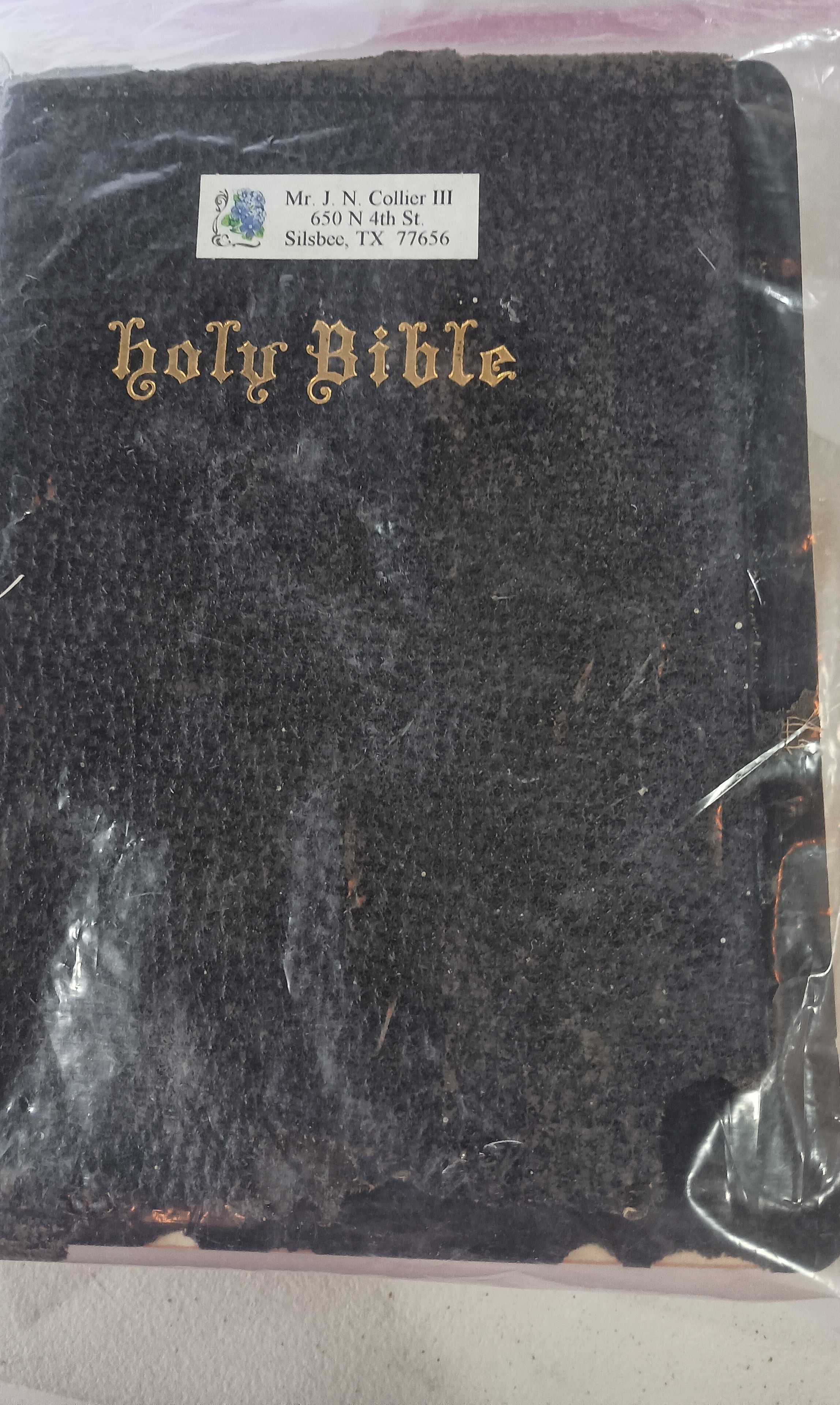 Holy Bible with Mr J N Collier III label - give to Melinda Stanton per S. Magee