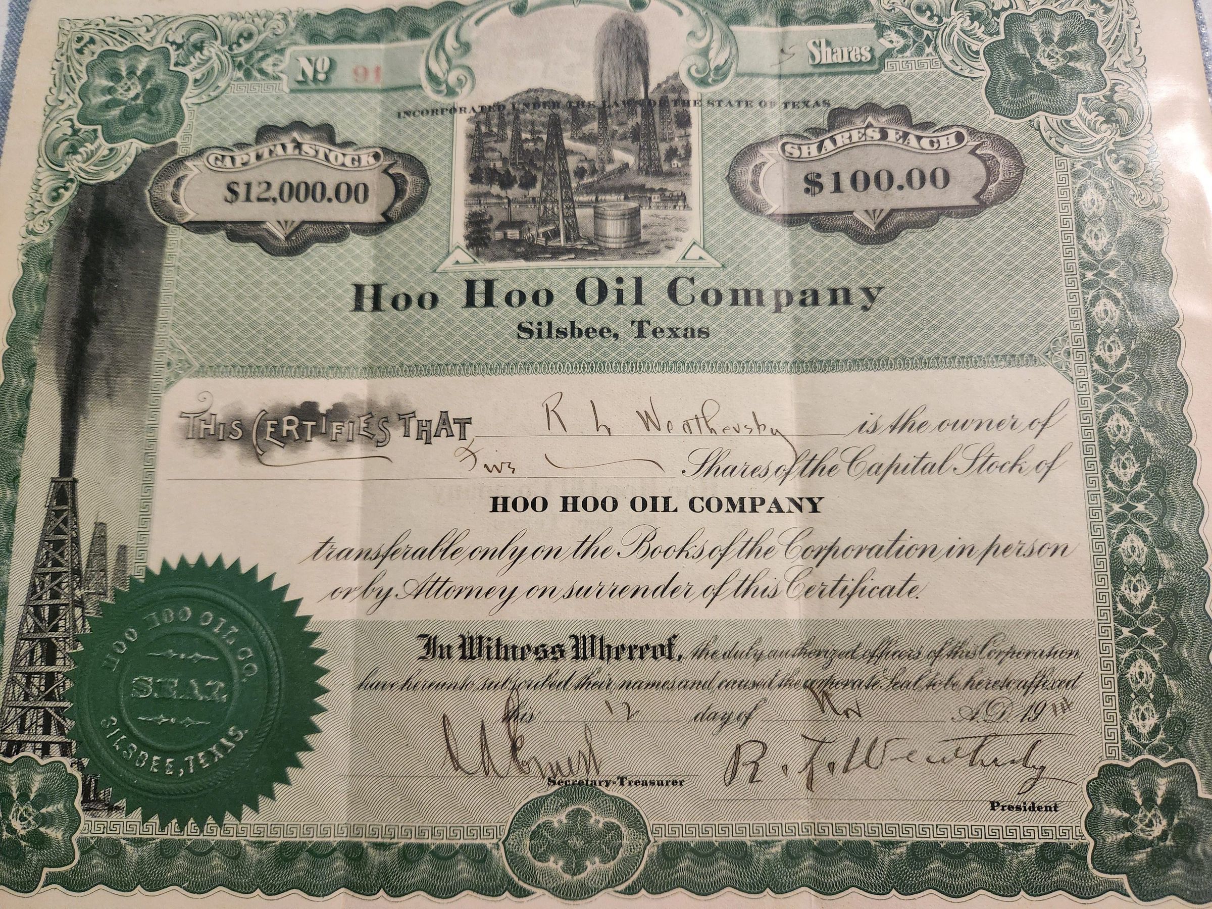 Hoo Hoo Oil Comany Capital Stock issued to R L Weathersby dated November 12, 1914 - $100Tags