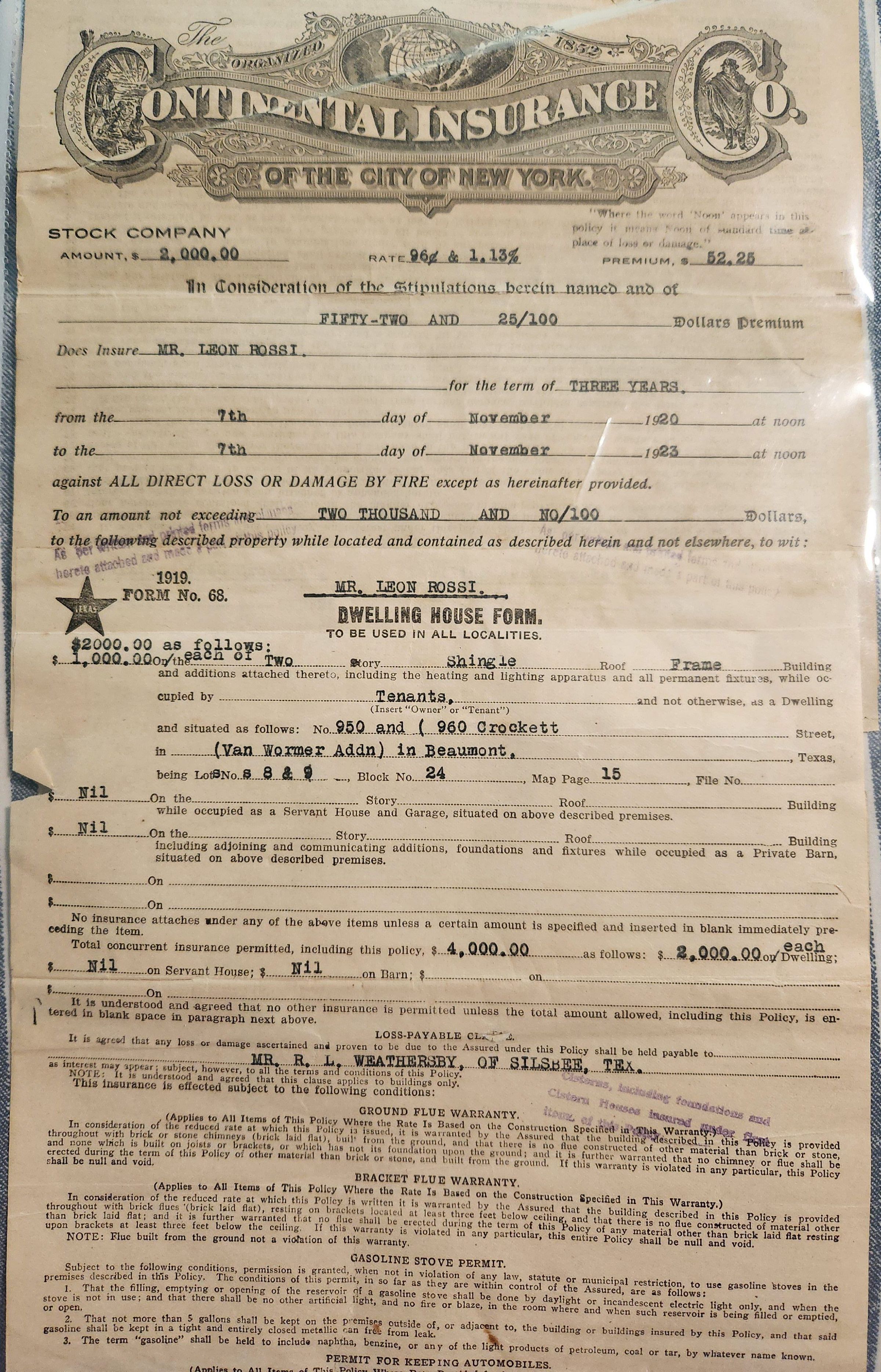 Insurance Policy for $2000 for Leon Rossi dated November 7, 1920 for Tenant HouseTags