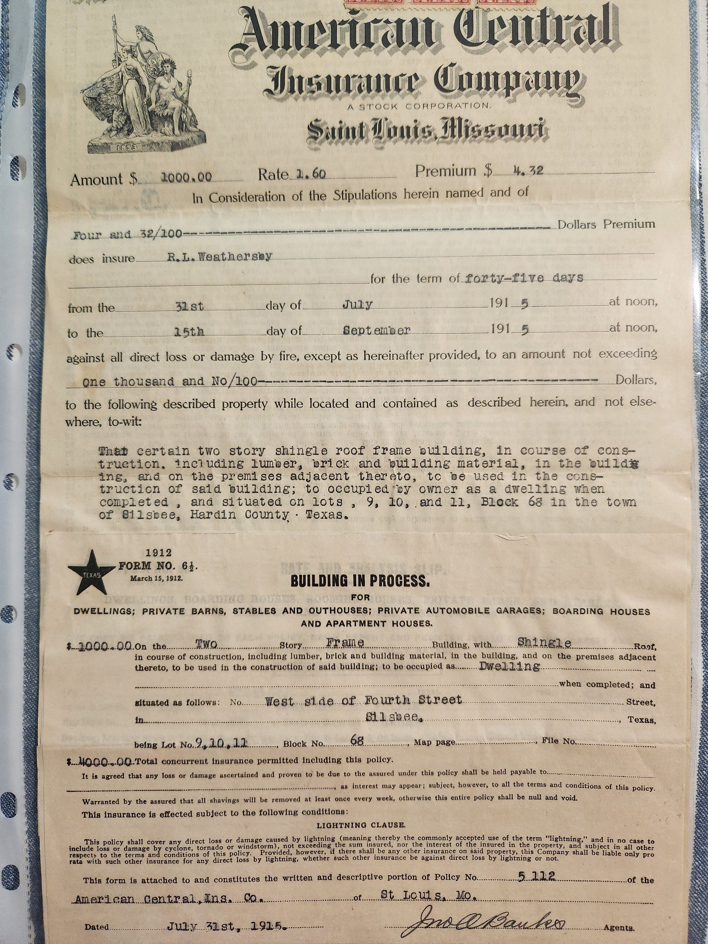 Insurance Policy from American Central Insurance Co to R L Weathersby for Home Construction dated July 31, 1915 to September 25th, 1915Tags