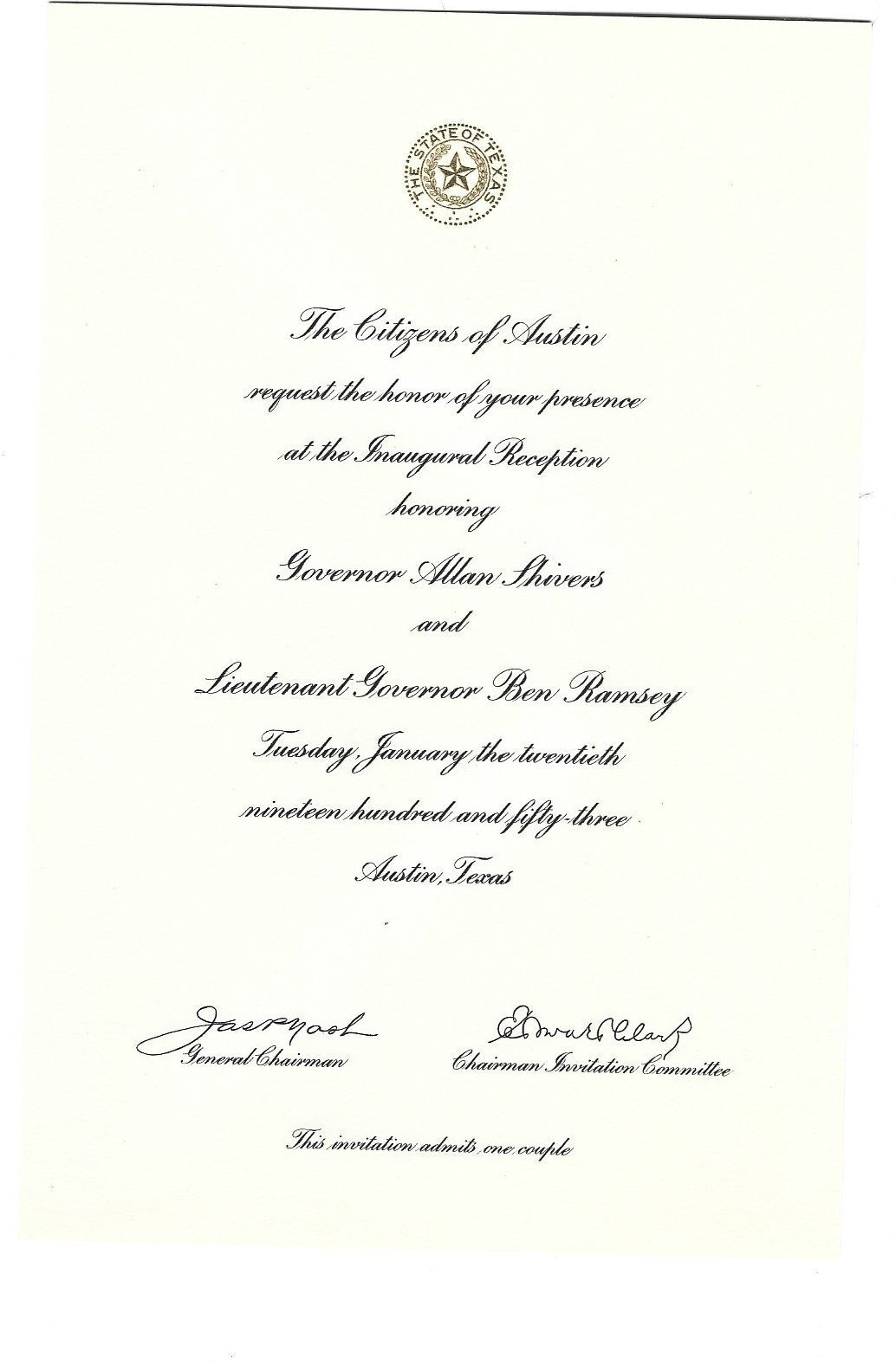 Invitation for David Read to the Inaugural Reception for Governor Allen Shivers and Lt Govenor Ben Ramsey January 12, 1953Tags