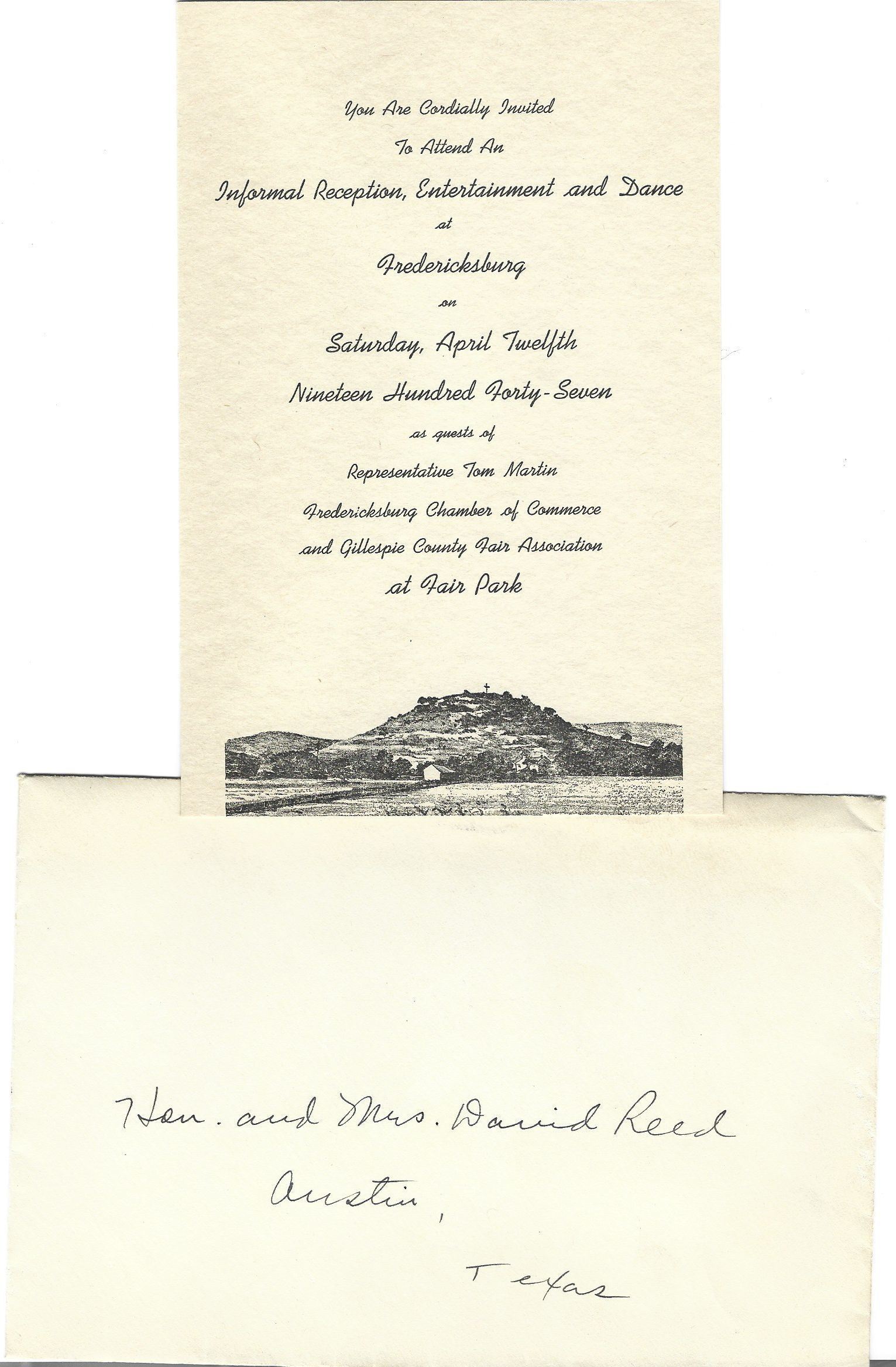 Invitation to David Read for Reception in Fredericsburg Texas for Representative Tom Martin April 12, 1947Tags