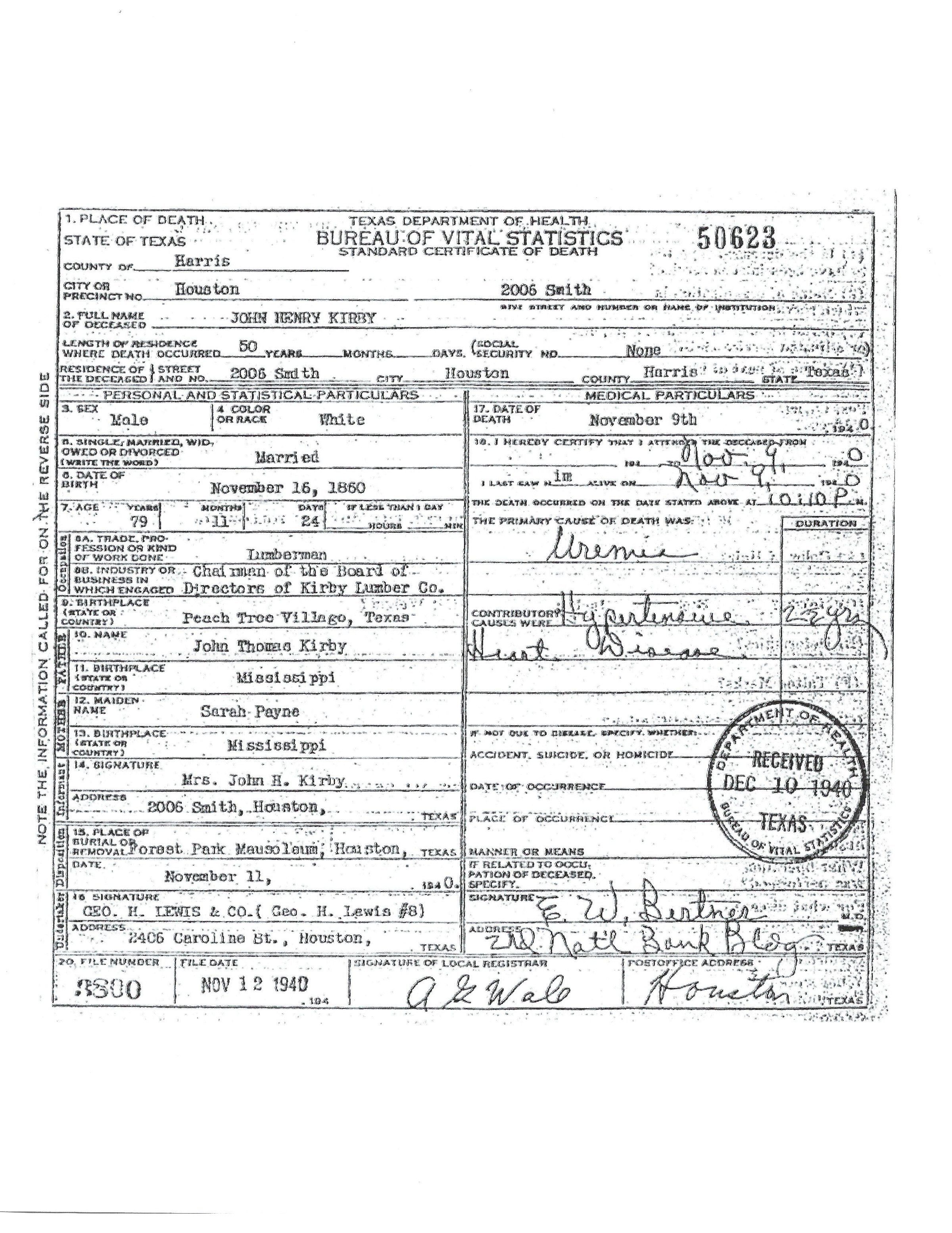 John Henry Kirby Death Certificate