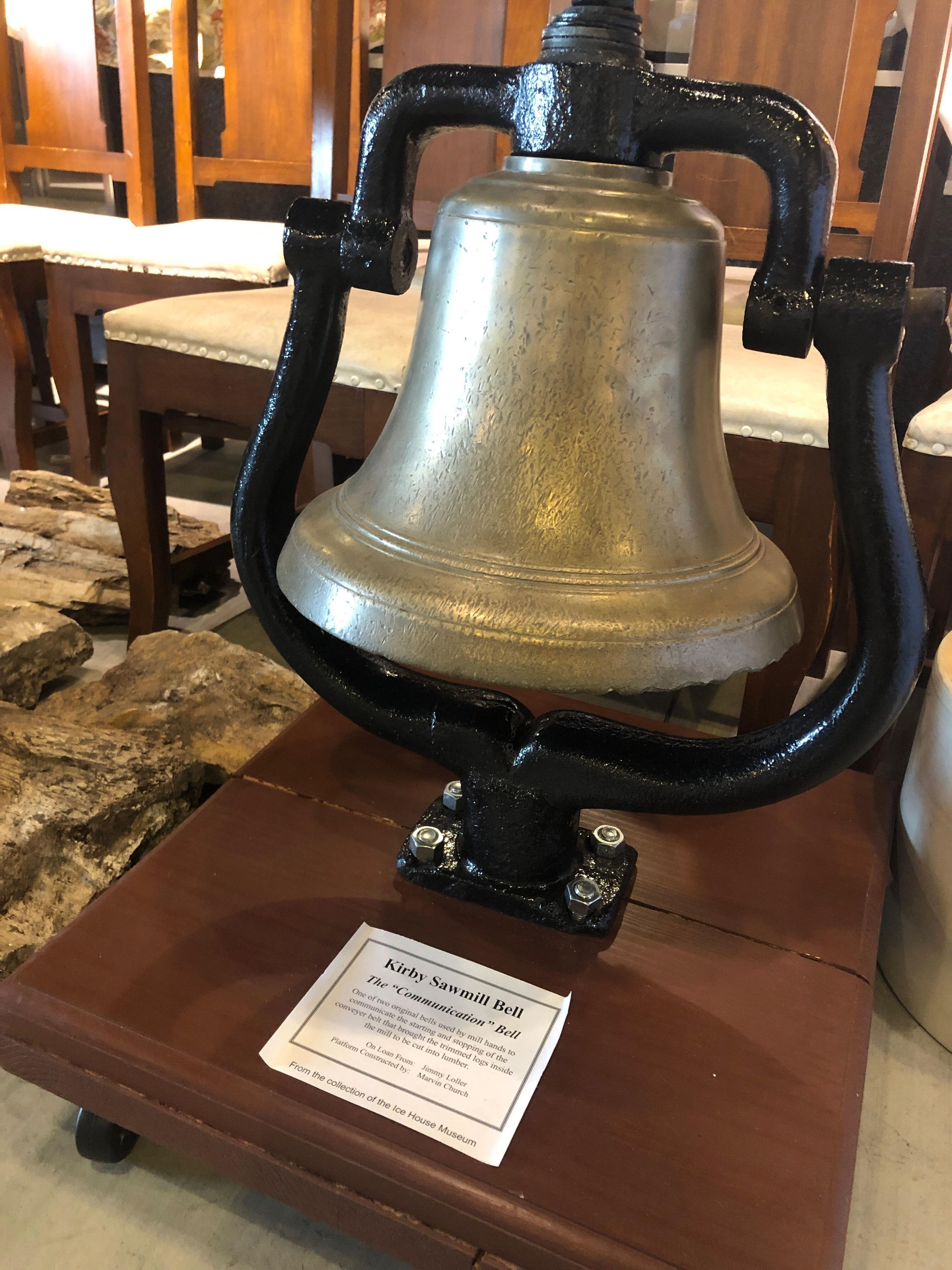 One of the two original bells used by mill hands to communicate the starting and stopping of the conveyer belt that brought the trimmed logs inside the mill to be cut into lumber.Collection